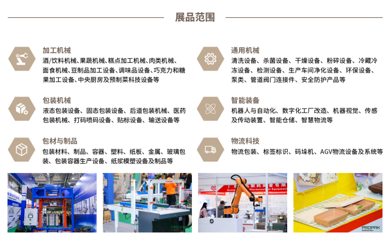 酒/饮料机械、果蔬机械、糕点加工机械、肉类机械、面食机械、豆制品加工设备、调味品设备、巧克力和糖果加工设备、中央厨房及预制菜科技设备等