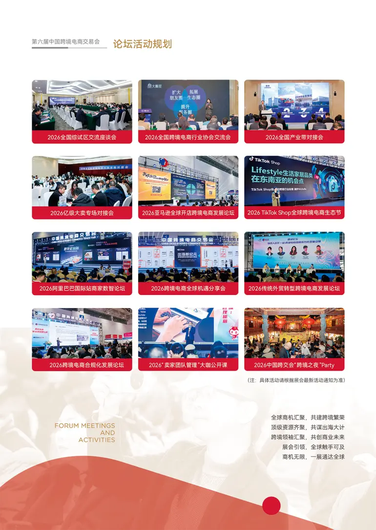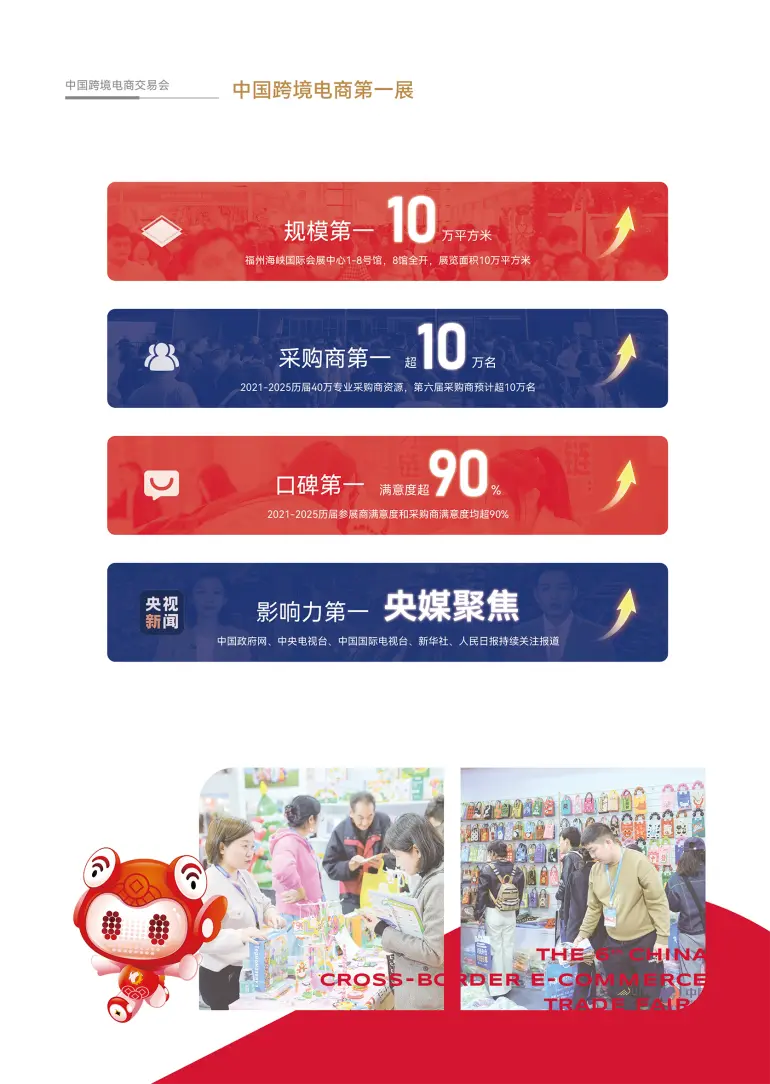 中国跨境电商交易会(简称“中国跨交会”)创办于2021年,每年3月18-20日在福州举办。凭借组展规模大、办展级别高、展示品类齐、采购邀请广、智库专家多、产业要素全等特点,中国跨交会已成为国内跨境电商行业最具规模、专业性的年度跨境电商展会之一。中国跨交会已连续多年由商务部外贸发展事务局主办,并成为国内第一个获得国际展览业协会(UFI)认证的跨境电商展会,是中国跨境电商公认的晴雨表和⻛向标。凡是过往,皆为序章。第六届中国跨境电商交易会正值展会第二个五年计划的开局之时,配套2026中国跨境电商大会,以“更好、更高、更远”的宗旨,力求再次打响全国跨境电商行业每年开春的第一炮。