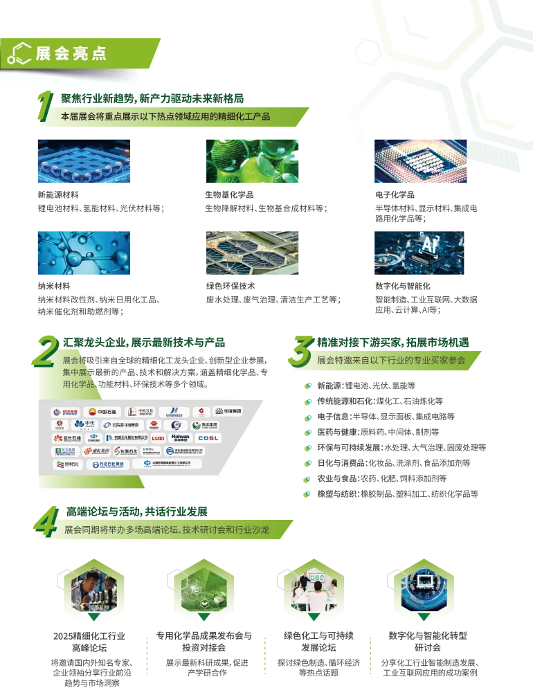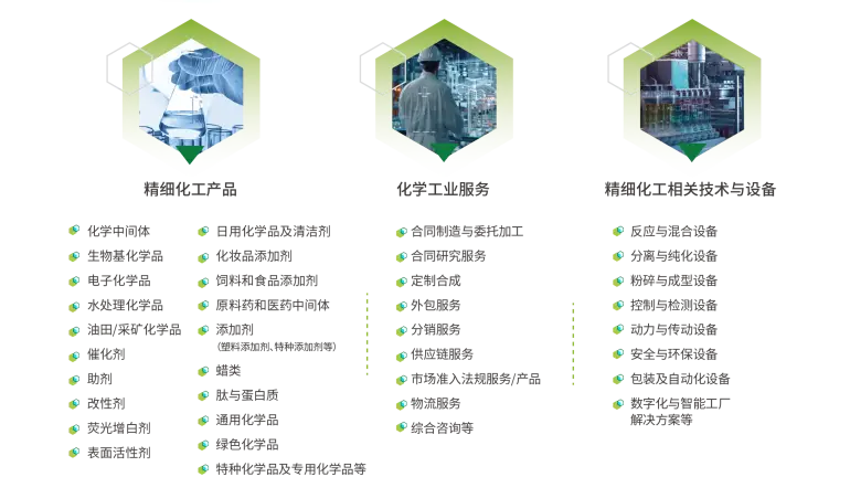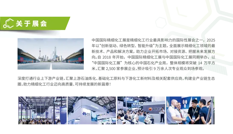中国国际精细化工展是精细化工行业最具影响力的国际性展会之一,2025年以“创新驱动、绿色转型、智能升级”为主题,全面展示精细化工领域的最新技术、产品和解决方案,助力企业开拓市场、对接资源、把握未来发展方向。自 2018 年开始,中国国际精细化工展与中国国际化工展同期举办,以'中国国际化工展”为核心的中国石化产业周,整体规模将突破 14 万平方米,汇聚 2,500 家参展企业,预计吸引9万余人次专业观众到场参观。深度打通行业上下游产业链,汇聚上游石油炼化、基础化工原料与下游化工新材料及相关配套供应商,构建全产业链生态圈,助力精细化工行业迈向高质量、可持续发展的新篇章!