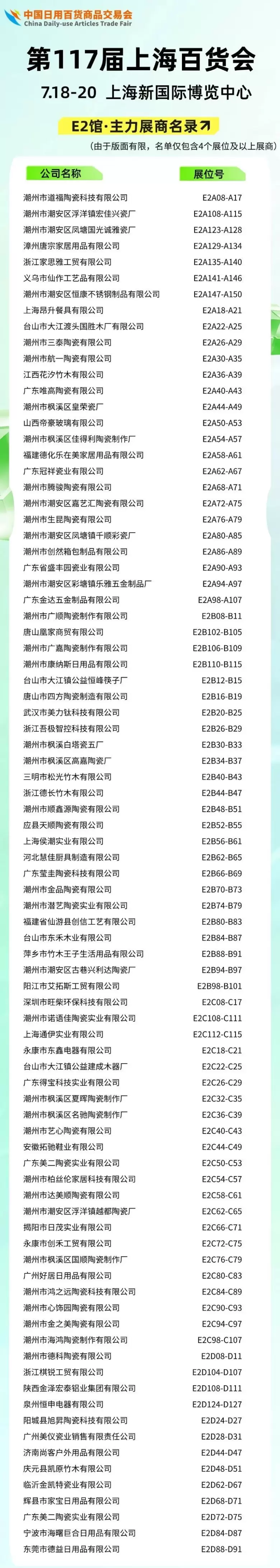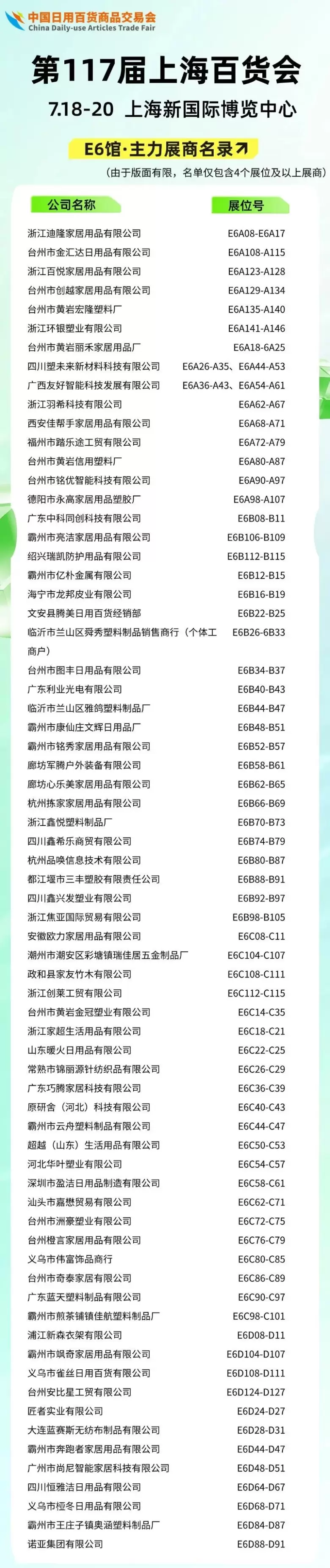 百货会以其丰富的产品品类和高质量的展商阵容而闻名。E馆(E1-E7)的主力展商名单已经曝光,这些展商代表了各自领域的前沿技术和创新产品: