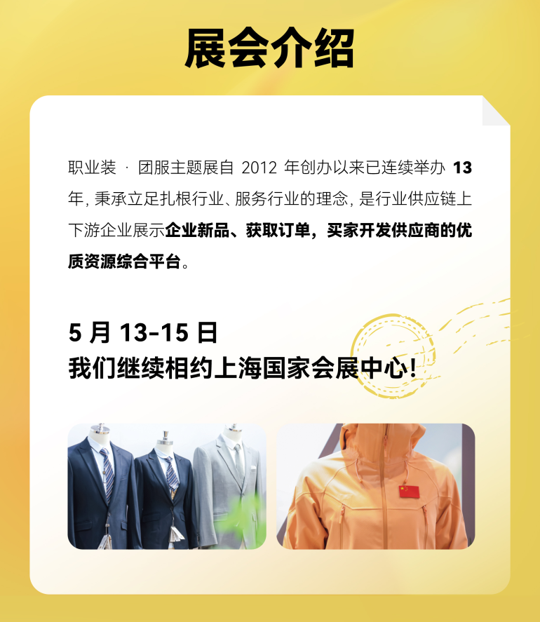 职业装・团服主题展自 2012 年创办以来已连续举办 13 年,秉承立足扎根行业、服务行业的理念,是行业供应链上下游企业展示企业新品、获取订单,买家开发供应商的优质资源综合平台。