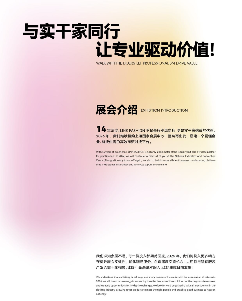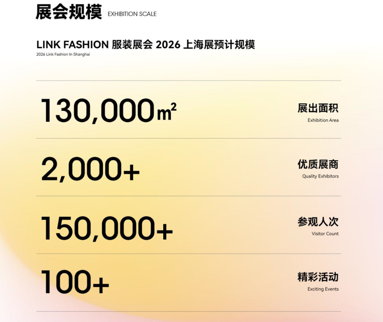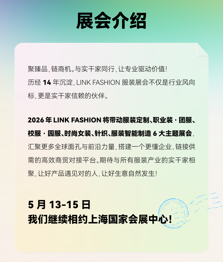 2026年5月13-15日,LINK FASHION服装展会(上海)盛大举办!服装定制、职业装·团服、校服·园服、时尚女装、针织、服装智能制造六大主题璀璨集结,2000+品质源头工厂与品牌商,共同为您呈现前沿趋势、新品爆品与高效的供应链资源。