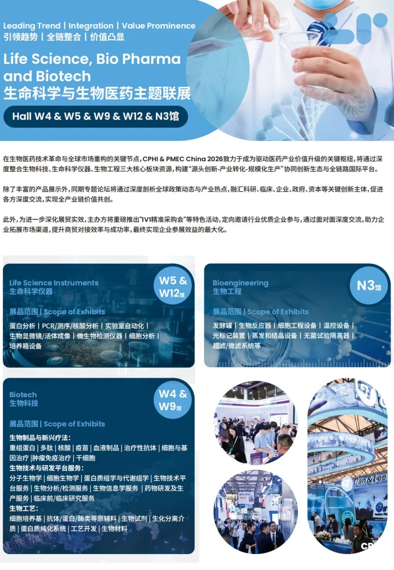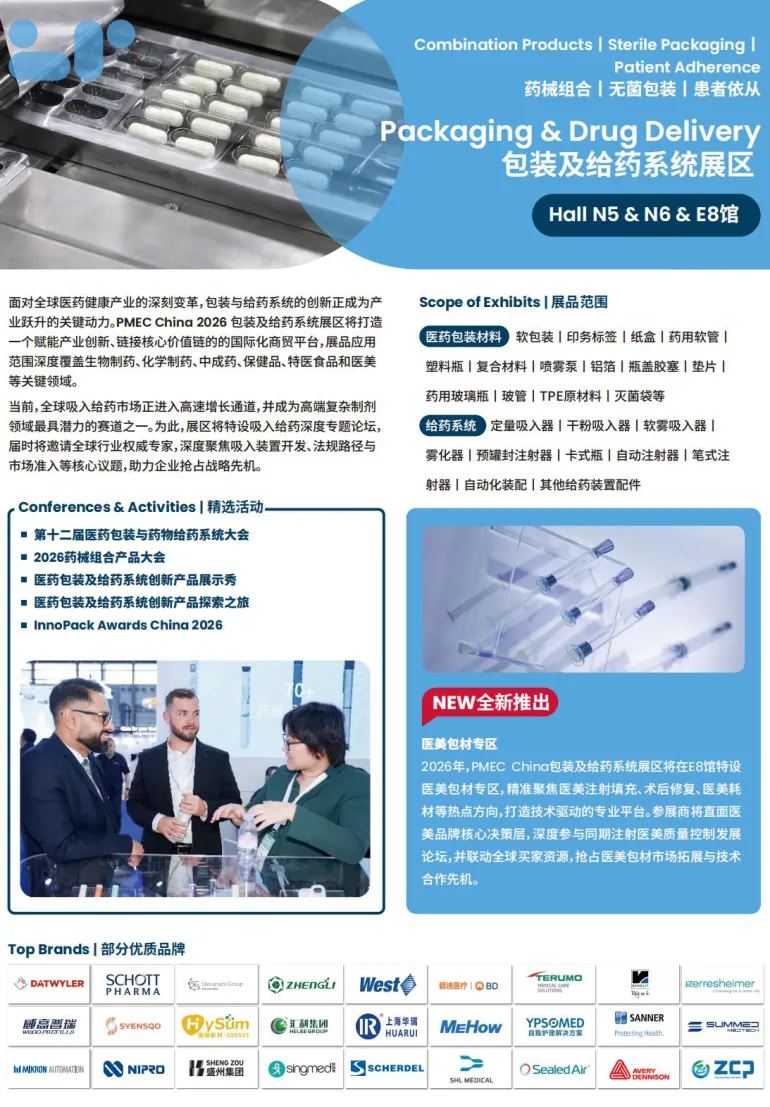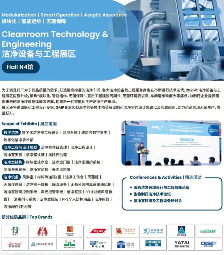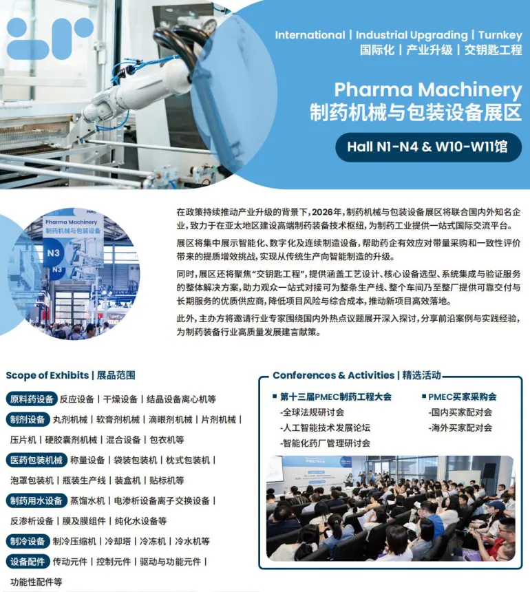 为满足业内对于高精度设备日益迫切的需求。2026年,“第十九届世界制药机械、包装设备与材料中国展(PMEC China 2026)” 将继续邀请优质展商为大家带来优质产品,并携手 “第二十四届世界制药原料中国展” (CPHI China 2026)打通制药行业产业链,助力制药行业新发展。