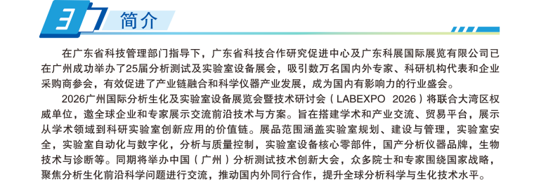 在广东省科技管理部门指导下,广东省科技合作研究促进中心及广东科展国际展览有限公司己在广州成功举办了25届分析测试及实验室设备展会,吸引数万名国内外专家、科研机构代表和企业采购商参会,有效促进了产业链融合和科学仪器产业发展,成为国内有影响力的行业盛会。