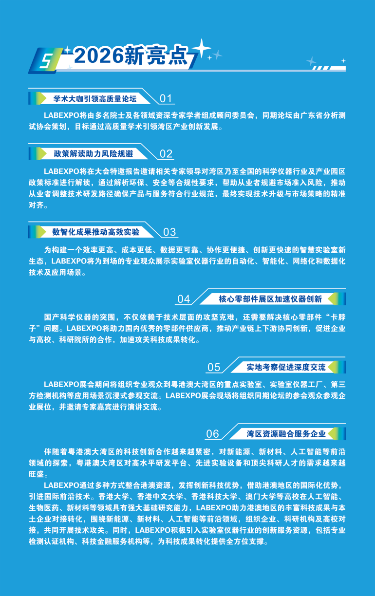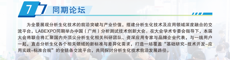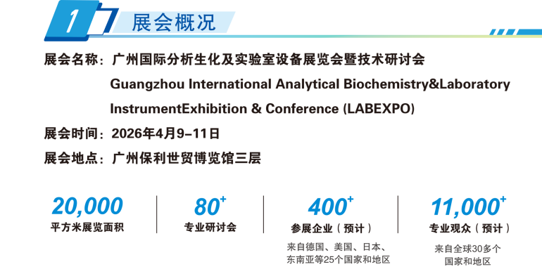 2026广州国际分析生化及实验室设备展览会暨技术研讨会(LABEXPO2026)将联合大湾区权威单位,邀全球企业和专家展示交流前沿技术与方案。旨在搭建学术和产业交流、贸易平台,展示从学术领域到科研实验室创新应用的价值链。展品范围涵盖实验室规划、建设与管理,实验室安全,实验室自动化与数字化,分析与质量控制,实验室设备核心零部件,国产分析仪器品牌,生物技术与诊断等。同期将举办中国(广州)分析测试技术创新大会,众多院士和专家围绕国家战略,聚焦分析生化前沿科学问题进行交流,推动国内外同行合作,提升全球分析科学与生化技术水平。