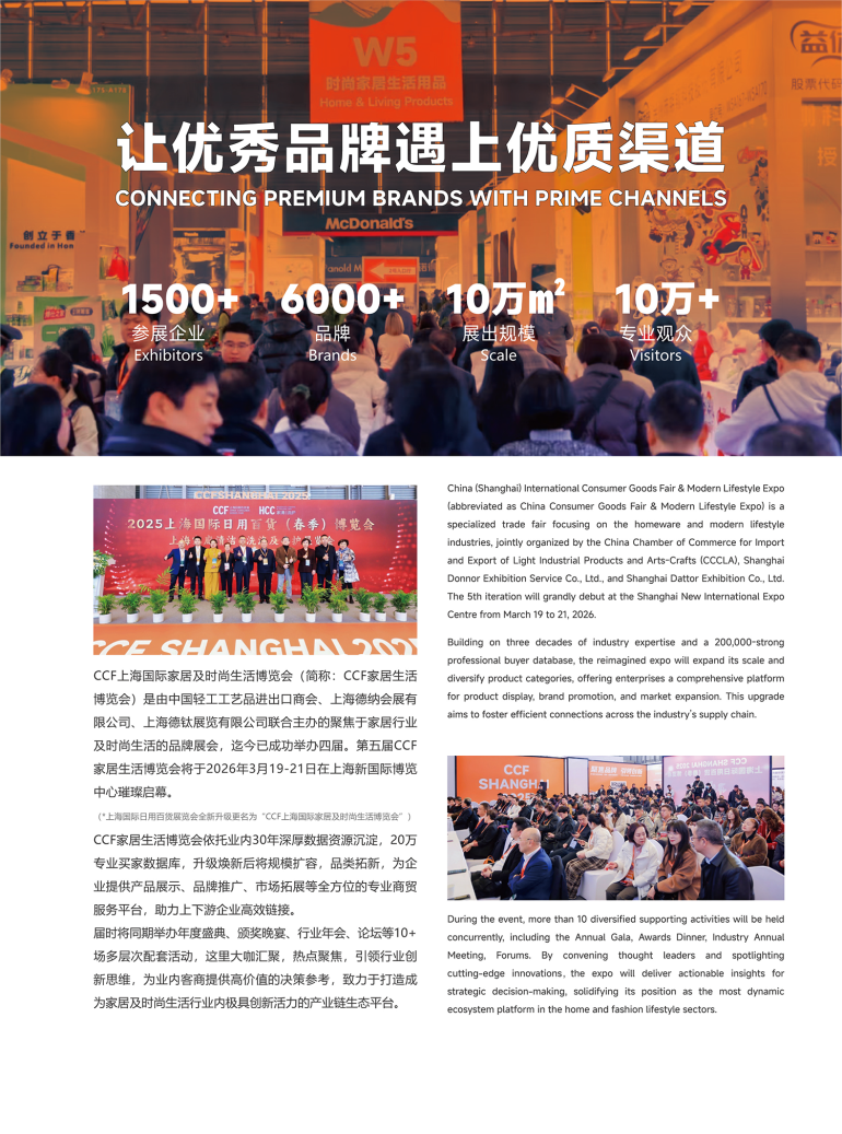 2026年,CCF博览会将全新升级更名为“CCF上海国际家居及时尚生活博览会”,周展期定档2026年3月19-21日。升级焕新的CCF博览会将规模扩容,品类拓新,为家居行业及时尚生活方式搭建更具价值的商贸服务平台。