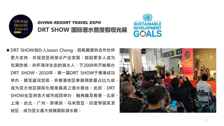 上海国际潜水及度假观光展(DRT SHOW Shanghai)作为一个重要的区域性活动已经取得了具有压倒性的反响,促进了品牌并受到高水平参展商的支持,并且引领了潜水装备商,水下运动品装备商,潜水度假中心,旅游局,海洋保护组织和潜水组织。上海国际潜水及度假观光展(DRT SHOW Shanghai)上届展会总面积30000平方米,参展企业350家均来自中国香港、印度、马来西亚、菲律宾等,参展人数达34000人。