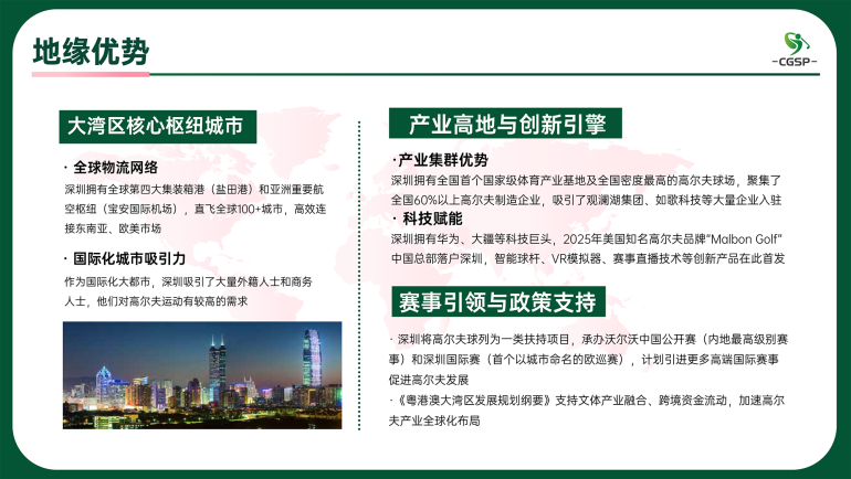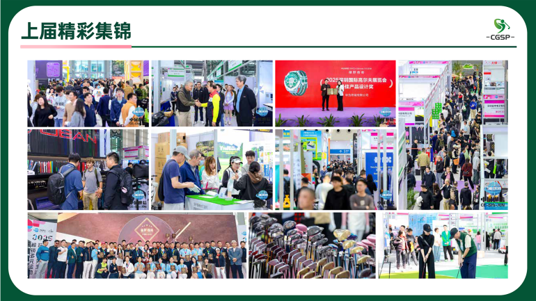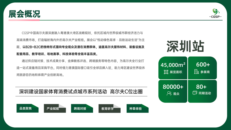 CGSP中国高尔夫展深度融入粤港澳大湾区战略规划,依托区域内世界级城市群经济活力与高端消费市场,打造辐射海内外的高尔夫产业枢纽。展会以"悦动绿色高球.品致运动生活"为主题,以B2B+B2C的独特形式面向专业观众及潜在消费群体,涵盖高尔夫服饰材料、装备设施及配套用品、教学培训、场地赛事、科技体验等全链丰富品类。