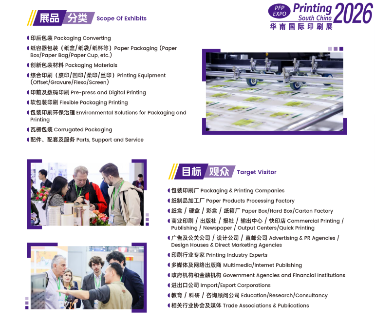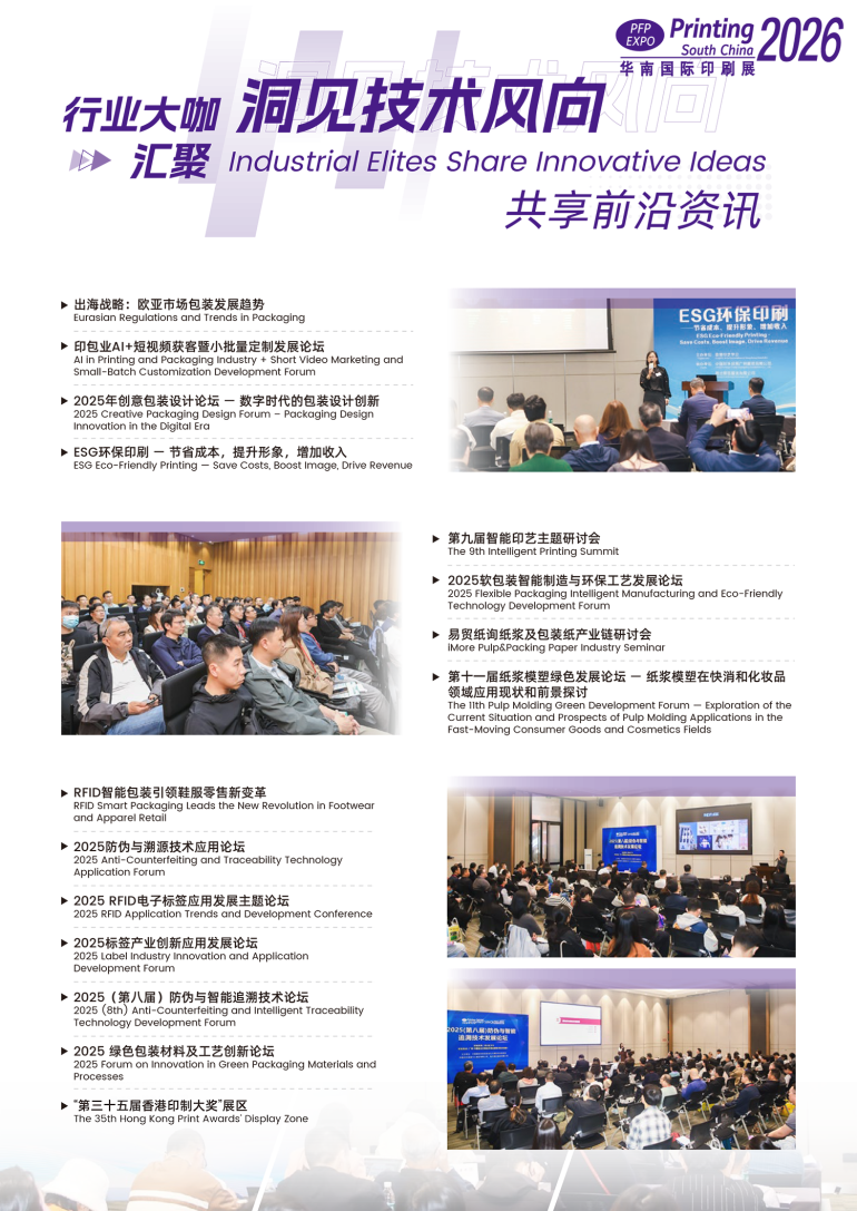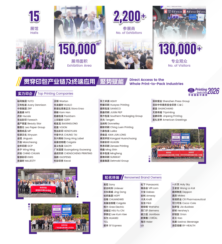 「华南国际印刷工业展览会」,伴随着行业踏入第三十二个春秋,携手「中国国际标签展」、「中国国际包装工业展」、「包装制品与材料展」,全面贯穿印刷包装产业链及终端应用,为企业提供印刷、标签、包装及包装制品“一站式”采购平台。