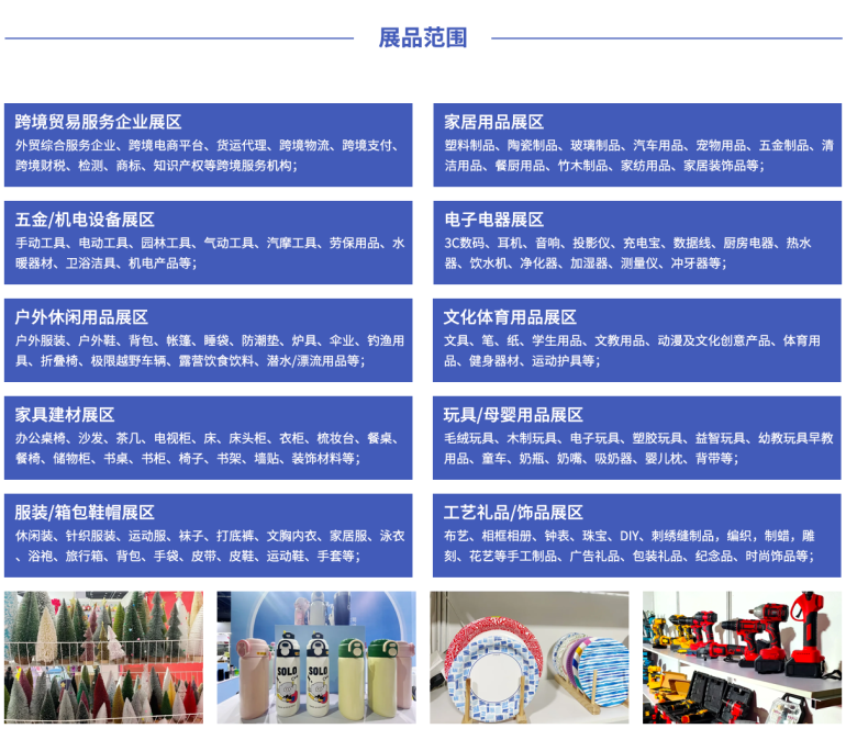 中国(义乌)外贸工厂展览会(同期:义乌国际物流展)展览与会面积5万平米,预设国际标准展位2200个,设跨境电商平台、外贸服务企业、外贸/跨境货源产品、物流与供应链管理、港口航运、货运代理、智慧物流/IT信息系统、仓储搬运等展区。