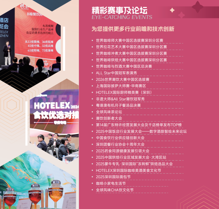 2025年12月16日-18日,2025深圳国际酒店及餐饮业博览会将继续在深圳国际会展中心(宝安新馆)盛大举办。展会覆盖咖啡与茶、饮品综合、食品及餐饮食材综合、餐饮设备、桌面用品、烘焙甜点及轻餐、酒类综合、礼品及生活方式八大核心板块,汇聚全球2500+优质展商,全面呈现从原料供应、智能设备到终端消费的全链条创新成果。