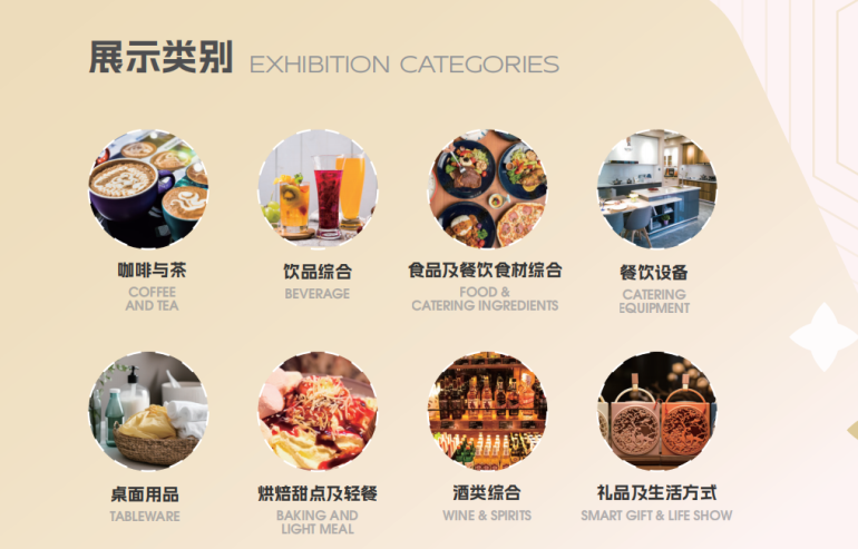 咖啡与茶、饮品综合、食品综合、餐饮食材、厨房设备与用品、冰淇淋与烘焙、餐饮设计及配套、连锁加盟及餐饮投资、酒类综合、桌面用品