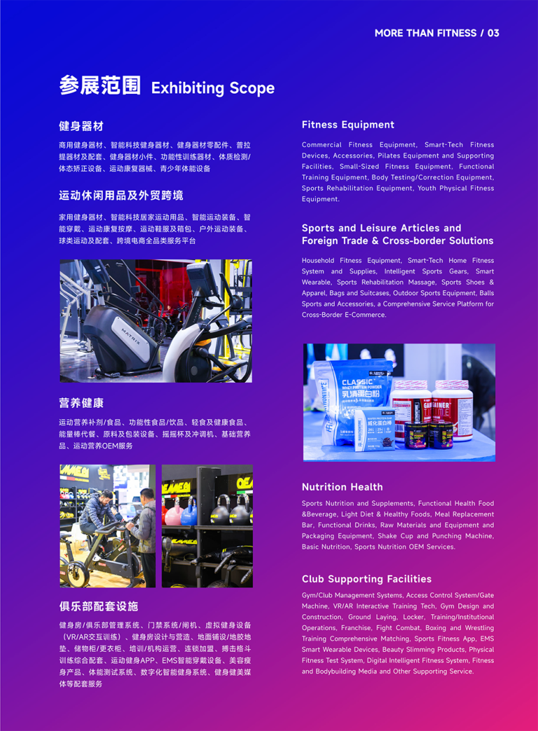 IWF组委会始终秉持“为客户创造更多商机"理念,致力于推动运动健身产业链各环节间资源的高效配置,全力发挥平台整合中心优势,以专业的配套服务协助参展商360°全景展贸精心策划新品发布、高端论坛、赛事竞技、颁奖典礼、互动表演等行业盛典活动,全方位呈现体育健康优质内容:搭建海内外从业者合作沟通桥梁、运动健身爱好者风采展示舞台,推广科学健康生活方式,响应国家“全民健身”号召,助推中国运动健身产业迁跃革新。