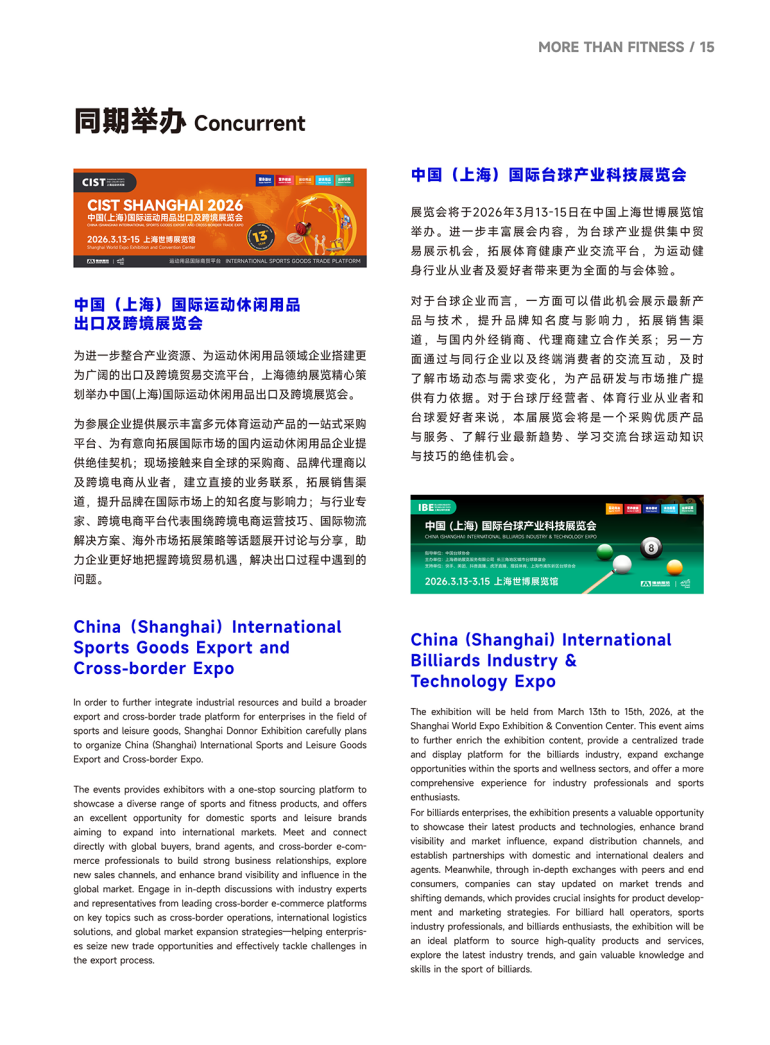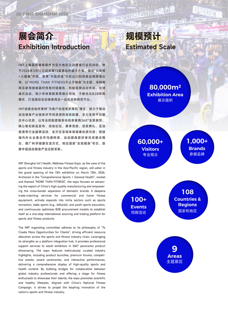 IWF上海国际健身展作为亚太地区运动健身行业风向标,将于2026年3月13日迎来第13届展会的盛大开幕 。锚定“大体育+大健康“市场,聚焦“中国质造”外贸出口和民族品牌跨境出海,以“MORE THAN FITNESS不止于健身”为主题,深耕商用及家用健身器材贸易对接服务,积极拓展运动休闲、台球桌式运动、青少年体育教育等细分领域,不断优化B2B采购模式,打造国际运动健身用品一站式采购商贸平台。