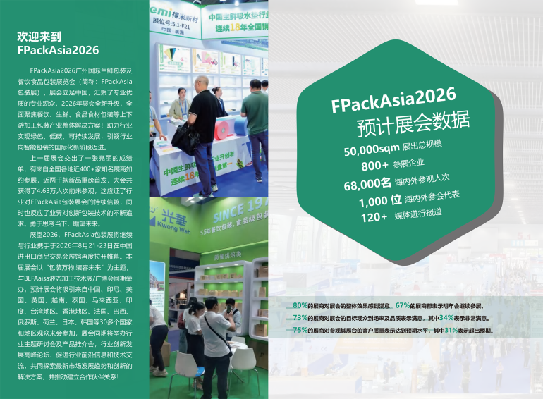FPackAsia2026广州国际生鲜包装及餐饮食品包装展览会(简称:FPackAsia包装展),展会立足中国,汇聚了专业优质的专业观众,2026年展会全新升级,全面聚焦餐饮、生鲜、食品食材包装等上下游加工包装产业整体解决方案!助力行业实现绿色、低碳、可持续发展,引领行业向智能包装的国际化新阶段迈进。