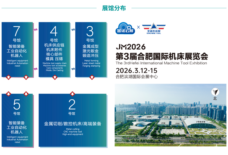 JM2026金诺.第3届合肥国际机床展将于3月12-15日在合肥滨湖国际会展中心举办!本届展览会集聚国际优质机床工具品牌展商,携带最新产品、金属切削/数控机床、激光钣金/金属成形、机床供应链/机床附件、模具加工及配件、智能制造/工业自动化/机器人等行业加工应用解决方案。