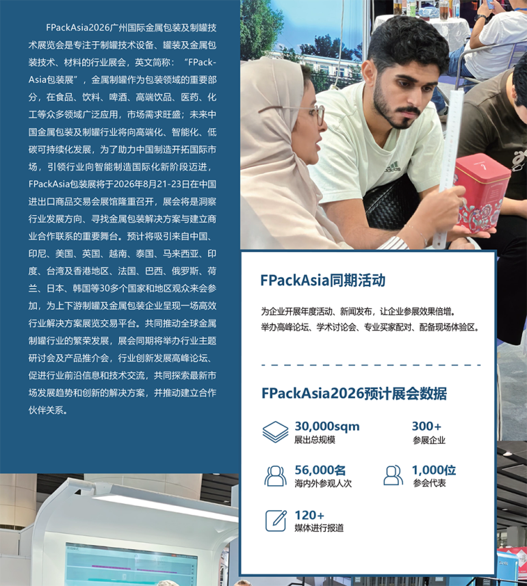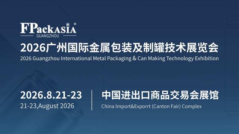 FPackAsia2026广州国际金属包装及制罐技术展览会是专注于制罐技术设备、罐装及金属包装技术、材料的行业展会,简称:“FPackAsia包装展”,金属制罐作为包装领域的重要部分,在食品、饮料、啤酒、高端饮品、医药、化工等众多领域广泛应用,市场需求旺盛;未来中国金属包装及制罐行业将向高端化、智能化、低碳可持续化发展,为了助力中国制造开拓国际市场,引领行业向智能制造国际化新阶段迈进,FPackAsia包装展将于2026年8月21-23日在中国进出口商品交易会展馆隆重召开,展会将是洞察行业发展方向、寻找金属包装解决方案与建立商业合作联系的重要舞台。预计将吸引来自中国、印尼、美国、英国、越南、泰国、马来西亚、印度、台湾及香港地区、法国、巴西、俄罗斯、荷兰、日本、韩国等30多个国家和地区观众来会参加,为上下游制罐及金属包装企业呈现一场高效行业解决方案展览交易平台。共同推动全球金属制罐行业的繁荣发展,展会同期将举办行业主题研讨会及产品推介会,行业创新发展高峰论坛、促进行业前沿信息和技术交流,共同探索最新市场发展趋势和创新的解决方案,并推动建立合作伙伴关系。