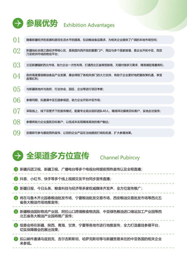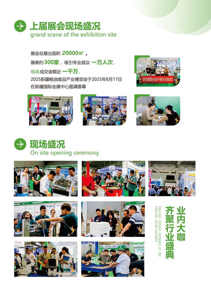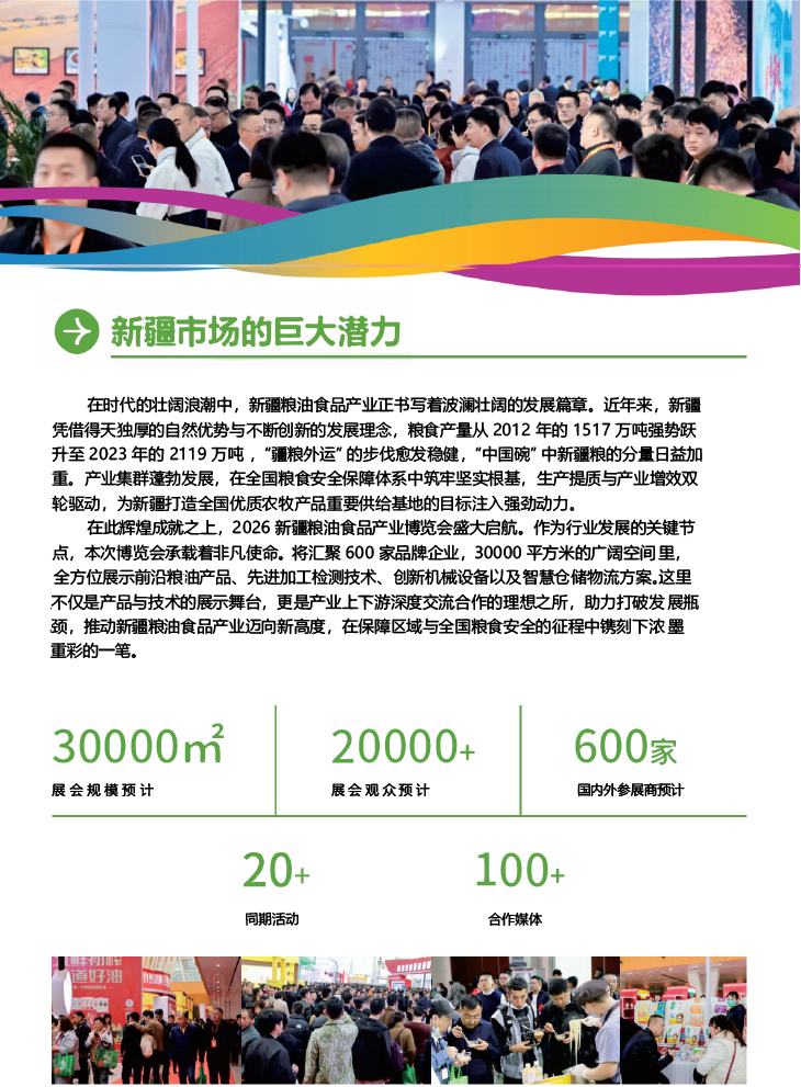 在此辉煌成就之上,2026新疆粮油食品产业博览会盛大启航。作为行业发展的关键节点,本次博览会承载着非凡使命。将汇聚600家品牌企业,30000平方米的广阔空间里,全方位展示前沿粮油产品、先进加工检测技术、创新机械设备以及智慧仓储物流方案。这里不仅是产品与技术的展示舞台,更是产业上下游深度交流合作的理想之所,助力打破发展瓶颈,推动新疆粮油食品产业迈向新高度,在保障区域与全国粮食安全的征程中镌刻下浓墨重彩的一笔。