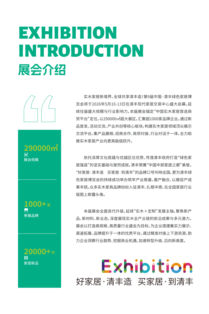 实木家居新境界,全球共享清丰造!第9届中国·清丰绿色家居博览会将于2026年5月10-13日在清丰现代家居交易中心盛大启幕。延续往届盛大规模与行业影响力,本届展会锚定“中国实木家居首选商贸平台”定位,以290000㎡超大展区,汇聚超1000家品牌企业。通过新品首发、活动交流、产业共创等核心板块,构建实木家居领域顶尖展示交流平台,集产品展销、招商合作、商贸对接、行业对话于一体,全力助推实木家居产业向更高能级跃升。