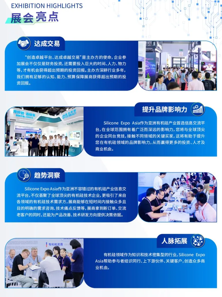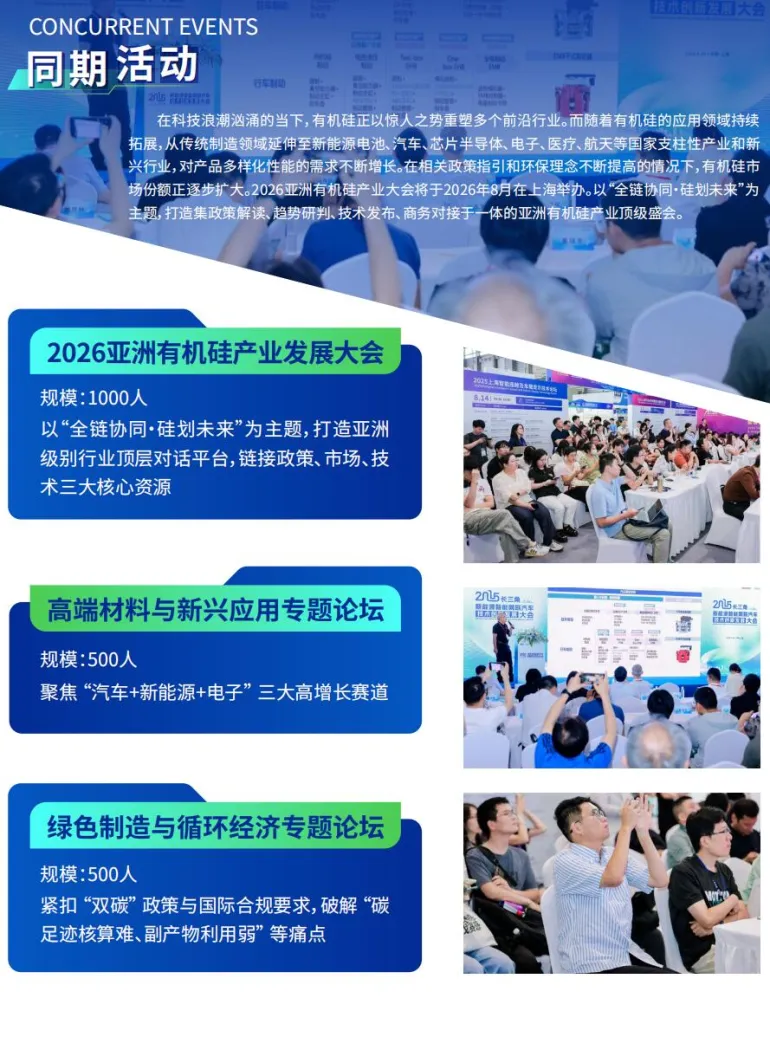 在此背景下,“2026亚洲有机硅产业大会暨展览会”定于2026年8月12日至14日在上海新国际博览中心举办,展览规模达12000㎡,大会以“全链协同·硅划未来——聚焦高端材料与绿色制造”主题。紧扣全球有机硅市场的增长机遇,以汽车、新能源、芯片半导体等高增长领域的需求为导向,构建“展-会-贸-服” 一体化生态,汇聚全球近300家有机硅产业链企业,专业观众将超70,000名,来自全球30多个国家和地区。通过展览展示、高端论坛、颁奖盛典与精准对接活动,打造产业高端化、绿色化、国际化发展的核心枢纽。