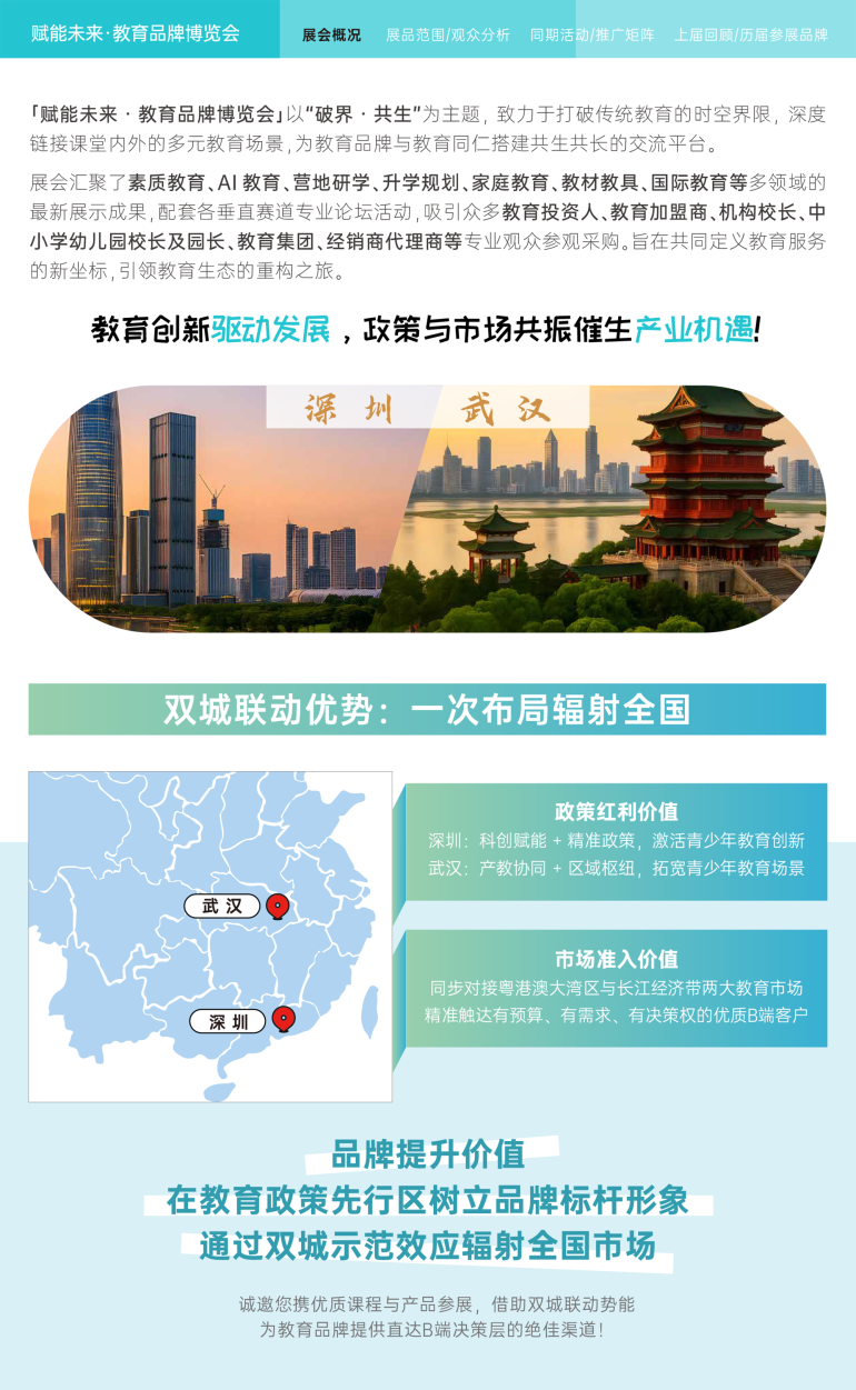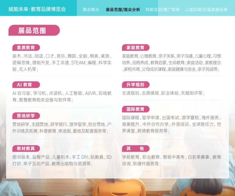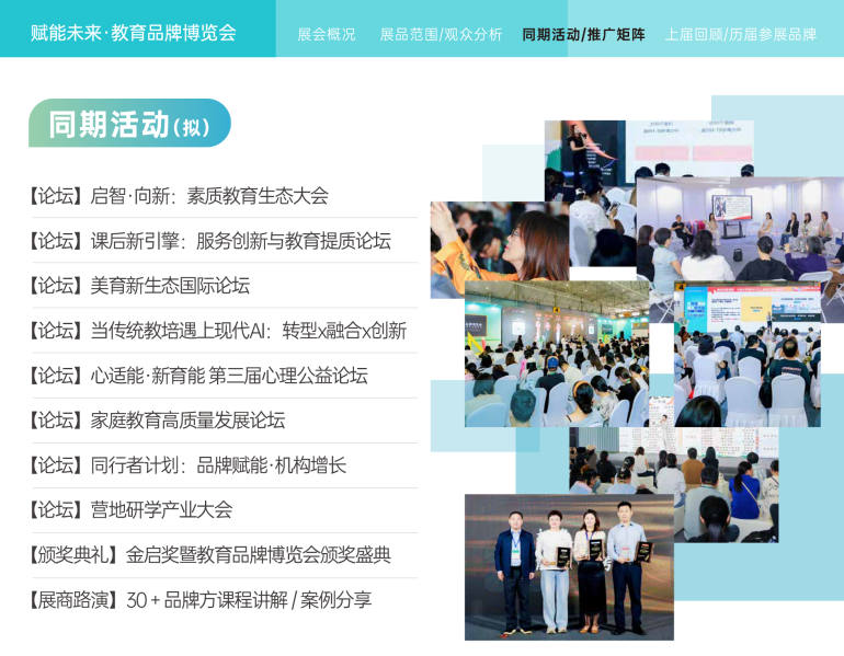 展会汇聚了素质教育、AI教育、营地研学、升学规划、家庭教育、教材教具、国际教育等多领域的最新展示成果,配套各垂直赛道专业论坛活动,吸引众多教育投资人、教育加盟商、机构校长、中小学幼儿园校长及园长、教育集团、经销商代理商等专业观众参观采购。