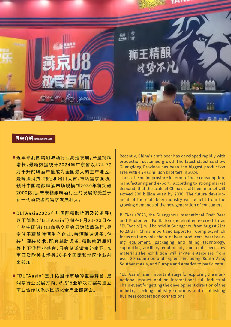 BLFAasia2026广州国际精酿啤酒及设备展(以下简称:“BLFAasia”)将在8月21-23日在广州中国进出口商品交易会展馆隆重举行,是专注于精酿啤酒生产企业、啤酒酿造设备、包装与灌装技术、配套辅助设备、精酿啤酒原料等上下游行业盛会,展会将邀请海外南亚、东南亚及欧美市场等30多个国家和地区企业前来参加。