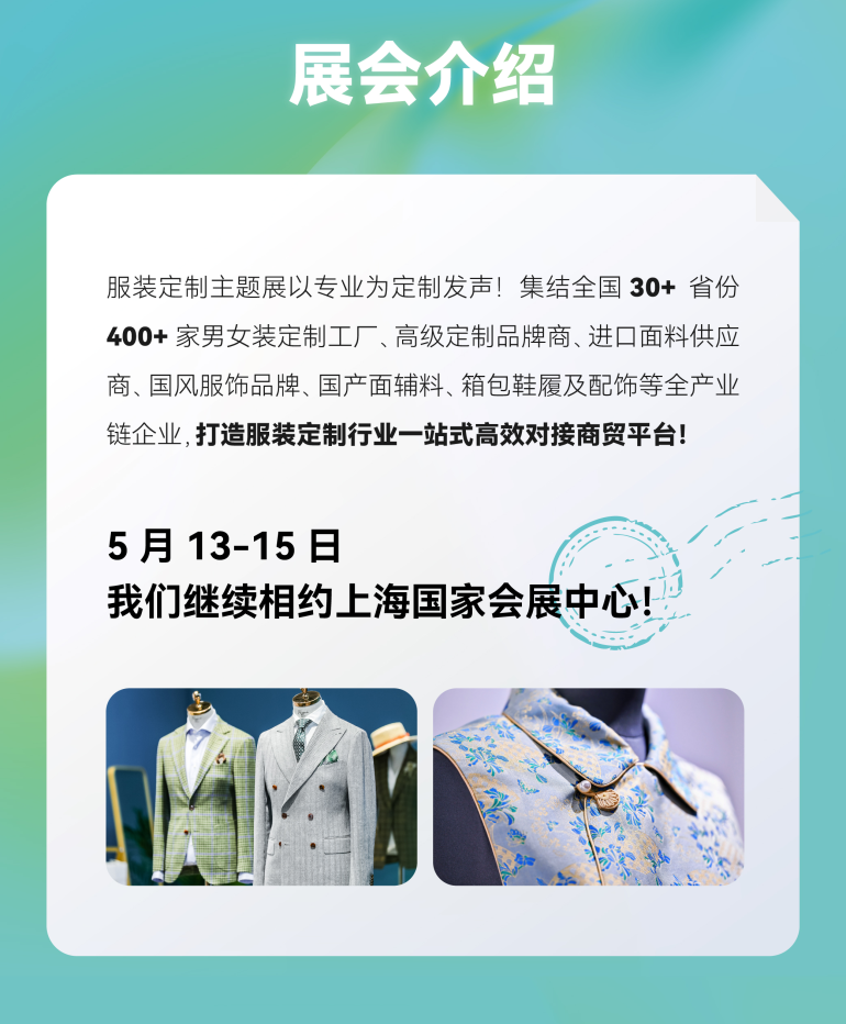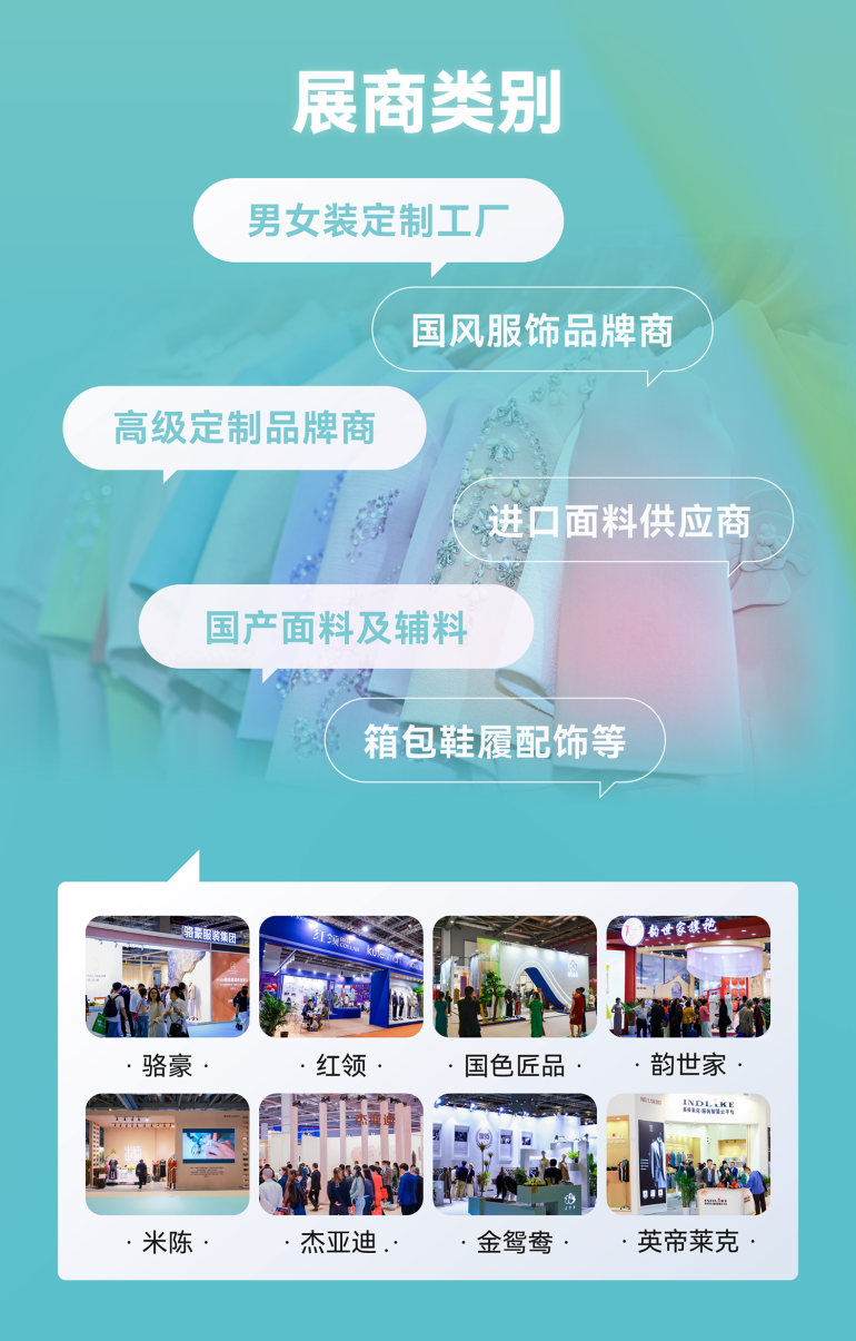 服装定制主题展以专业为定制发声!集结全国30+省份400+家男女装定制工厂、高级定制品牌商、进口面料供应商、国风服饰品牌、国产面辅料、箱包鞋履及配饰等全产业链企业,打造服装定制行业一站式高效对接商贸平台!