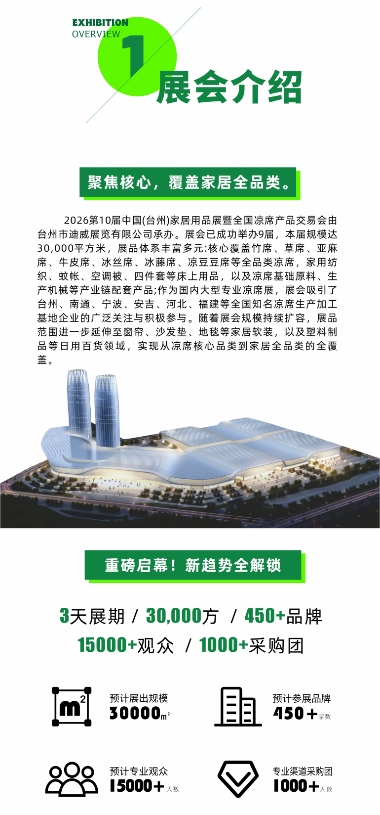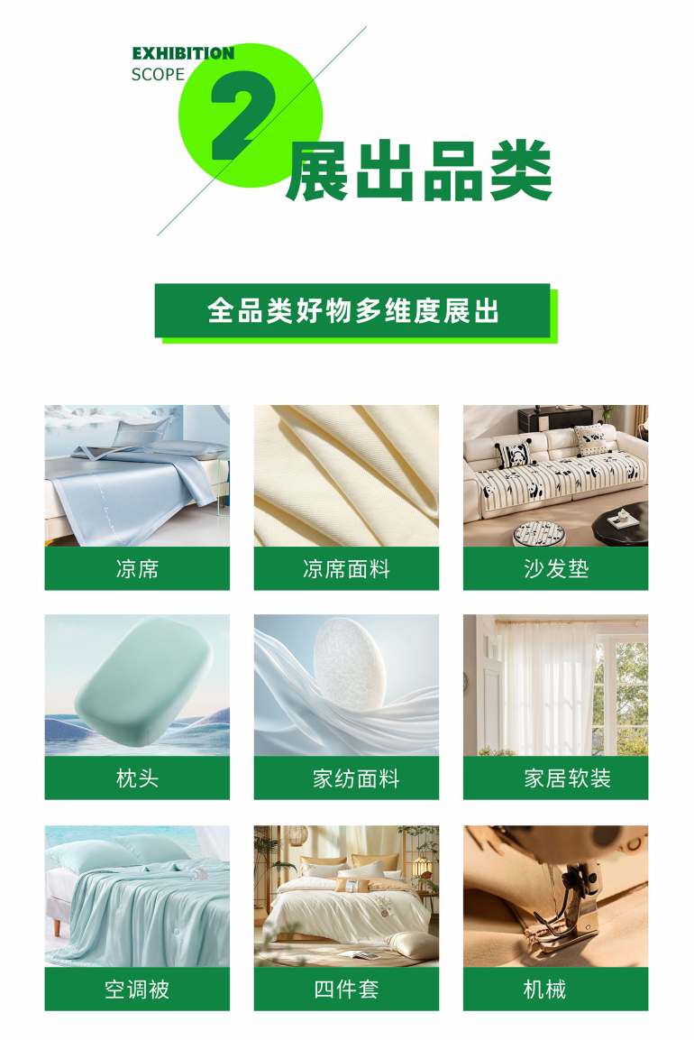 2026第10届中国(台州)家居用品展暨全国凉席产品交易会已成功举办9届,本届规模达30,000平方米,展品体系丰富多元:核心覆盖竹席、草席、亚麻席、牛皮席、冰丝席、冰藤席、凉豆豆席等全品类凉席,家用纺织、蚊帐、空调被、四件套等床上用品,以及凉席基础原料、生产机械等产业链配套产品;作为国内大型专业凉席展,展会吸引了台州、南通、宁波、安吉、河北、福建等全国知名凉席生产加工基地企业的广泛关注与积极参与。随着展会规模持续扩容,展品范围进一步延伸至窗帘、沙发垫、地毯等家居软装,以及塑料制品等日用百货领域,实现从凉席核心品类到家居全品类的全覆盖。