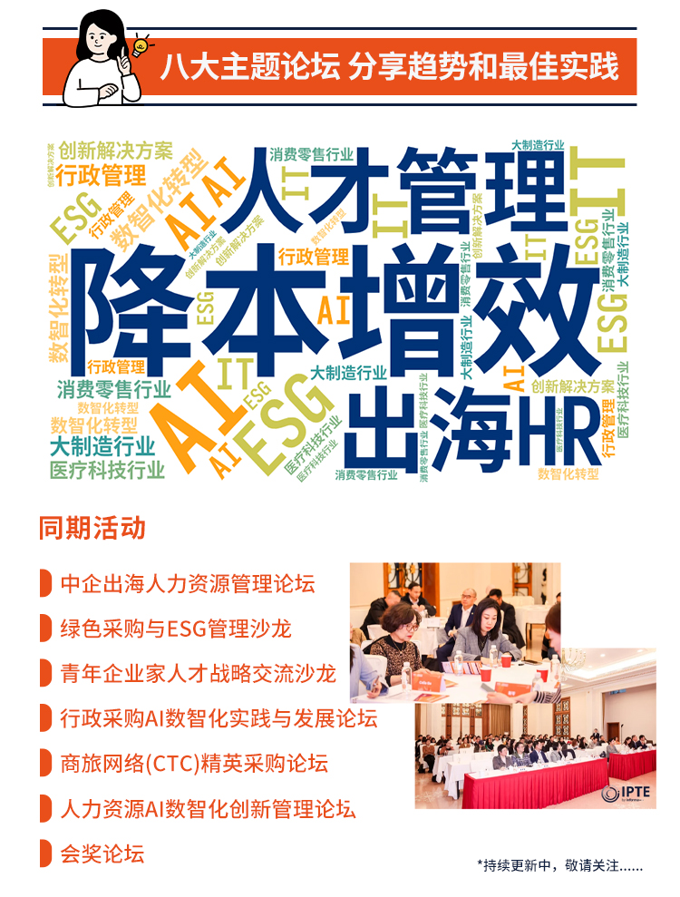 上海国际后勤资源采购贸易展览会(IPTE),汇聚全球领先企业服务供应商,是专注于企业后勤采购产业链解决方案的B2B平台。展会面向HR、行政、财务、法务、IT等领域的采购决策者,提供一站式资源对接、行业洞察与最佳实践分享平台。