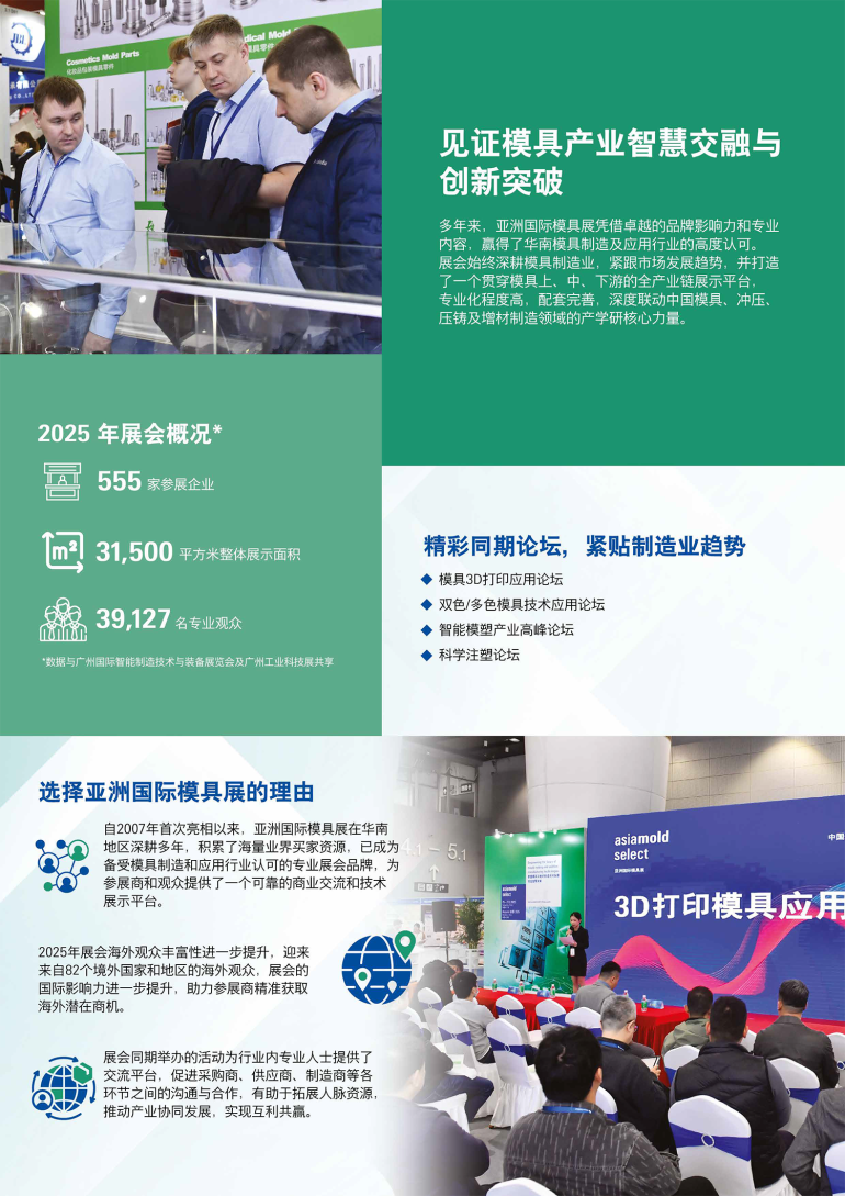 Asiamold Select多年来凭借着优良的品牌和专业的内容备受华南模具制造和应用行业认可,始终深度扎根模具制造业,紧跟市场发展趋势, 加上联合主办方广东省模具工业协会的资源整合,打造出一个贯穿模具上中下游,专业化程度高,配套完善的模具全产业链展示平台。