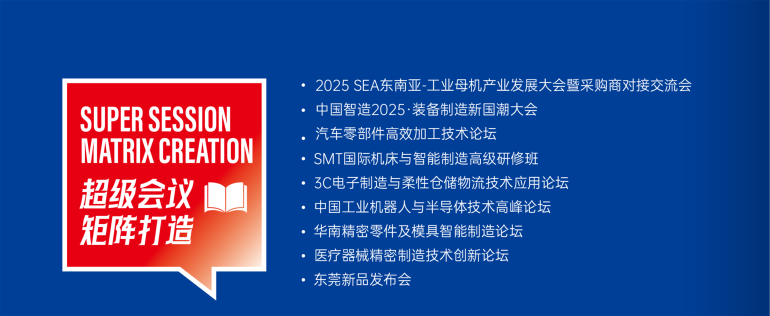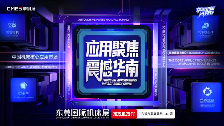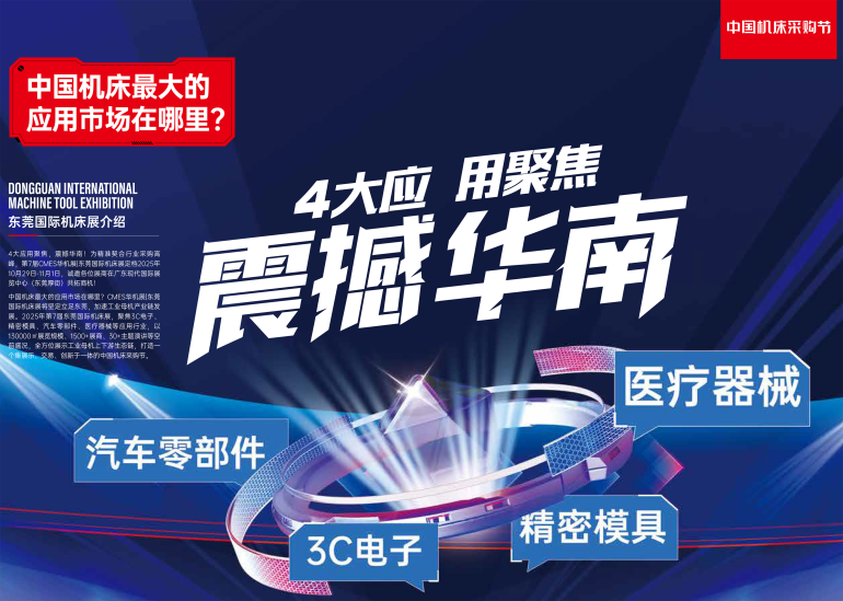 4大应用聚焦,震撼华南!为精准契合行业采购高峰,第7届CMES华机展l东莞国际机床展定档2025年10月29日-11月1日,诚邀各位展商在广东现代国际展览中心(东莞厚街)共拓商机!中国机床最大的应用市场在哪里?CMES华机展|东莞国际机床展将坚定立足东莞,加速工业母机产业链发展。2025年第7届东莞国际机床展,聚焦3C电子、精密模具、汽车零部件、医疗器械等应用行业,以130000㎡展览规模、1500+展商、30+主题演讲等空前盛况,全方位展示工业母机上下游生态链,打造一个集展示、交易、创新于一体的中国机床采购节。