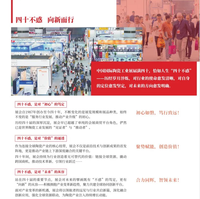 2026年6月24-27日,第40届中国国际陶瓷工业展览会将在广州广交会展馆A区盛大举办。由中国轻工业联合会、中国建筑材料联合会、中国建筑卫生陶瓷协会、中国陶瓷工业协会、中国贸促会建材分会、新之联展览公司、北京建展公司等单位联合举办,凝聚各方力量、整合各类资源,携手共创行业发展新局面。