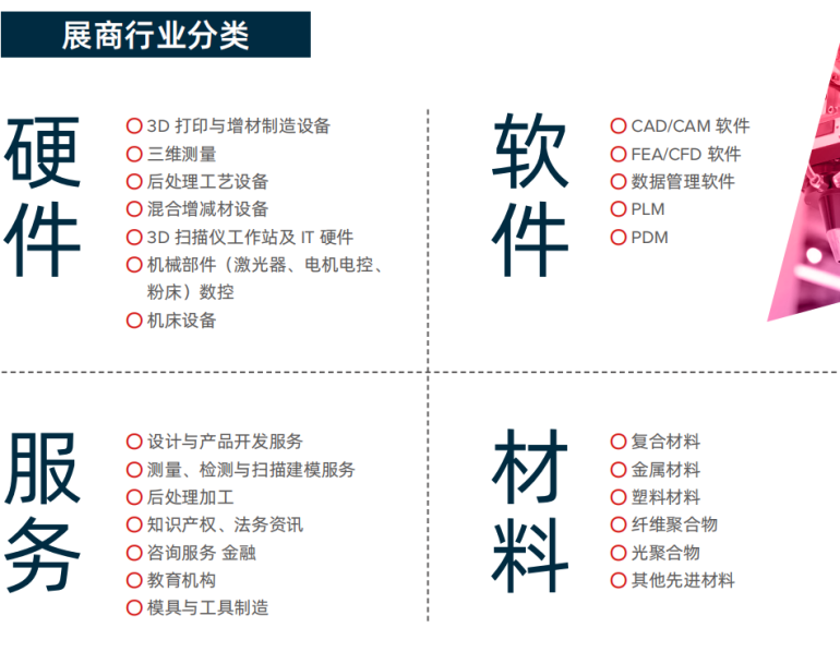 服务:设计与产品开发服务;测量、检测与扫描建模服务;后处理加工;知识产权、法务资讯;咨询服务、金融;教育机构;模具与工具制造