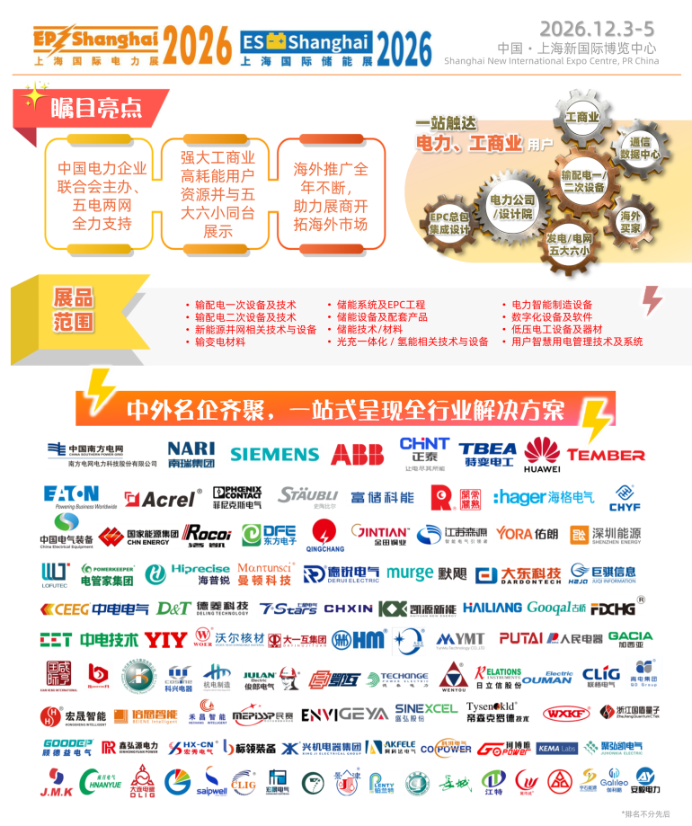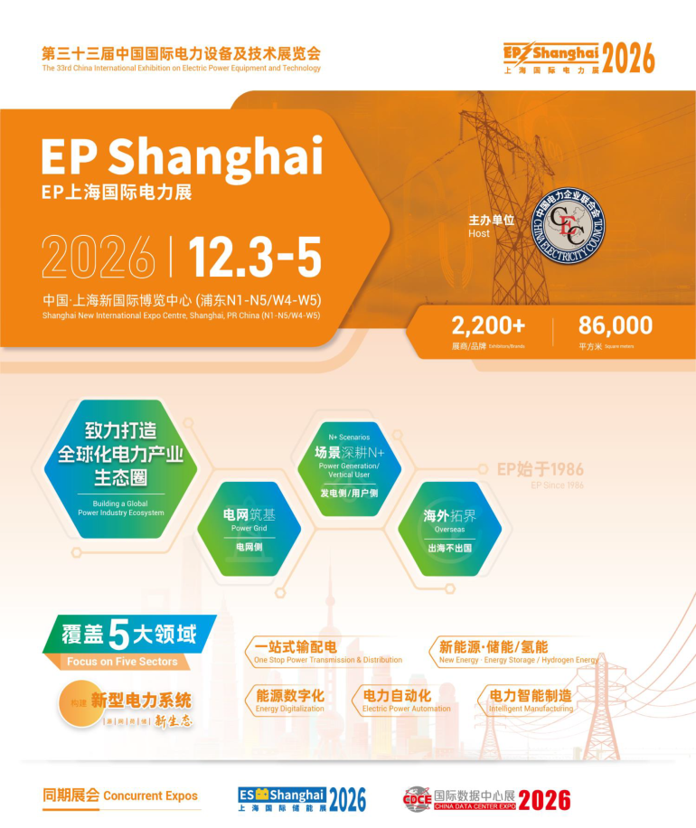 国内电力行业具规模及影响力的品牌电力展—国际电力电工展(EP) 始于1986年,由中国电力企业联合会主办, 雅式展览服务有限公司承办。 承蒙业界人士及海内外参展商多年来的大力支持,2026年将迎来「第三十三届中国国际电力设备及技术展览会 (EP Shanghai 2026)」暨「上海国际储能技术应用展览会(ES Shanghai 2026) 」。展会于2026年12月3 – 5 日,在中国‧上海新国际博览中心(N1 - N5、W4 及 W5 馆)盛大举行。展会面积将扩大至86,000平方米,预计吸引来自中外2,200家参展商/品牌!