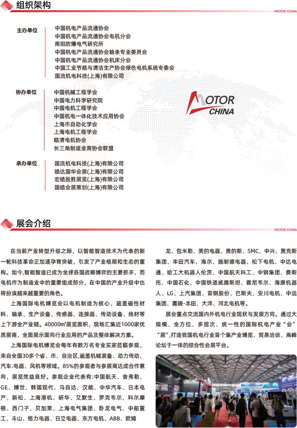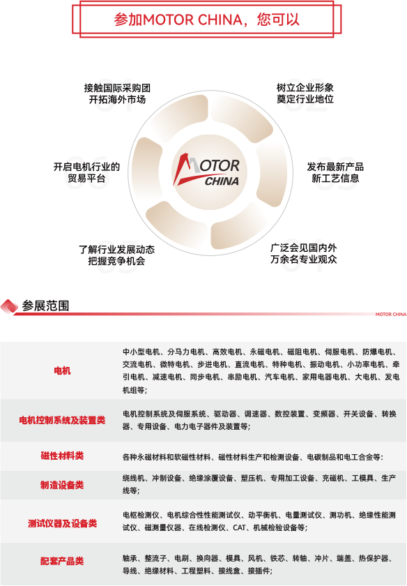 上海国际电机博览会以电机制造为核心,涵盖磁性材料、轴承、生产设备、传感器、连接器、传动设备、线材等上下游全产业链。40000㎡展览面积,现场汇集近1000家优质展商,全面展示面向行业应用的产品及整体解决方案。