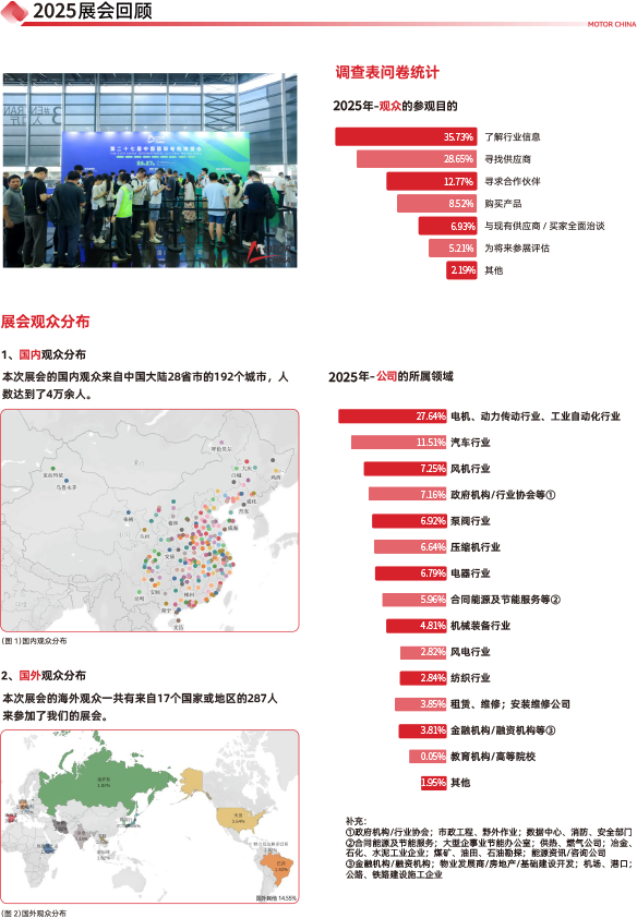 上海国际电机博览会每年有数万名专业买家莅临参观,来自全国30多个省、市、自治区,涵盖机械装备、动力传动、汽车.电器、风机等领域。85%的参观者与参展商达成合作意向,展览效益良好。参观企业代表有:中国航天、舍弗勒、GE、博世、韩国现代、马自达、汉能、中华汽车、日本电产、新松、上海港机、研华、艾默生、罗克韦尔、科尔摩根、西门子、贝加莱、上海电气集团、卧龙电气、中船重工、斗山、格力电器、日立电器、东方电机、ABB、欧姆中国机电产品流通协会中国机电产品流通协会电机分会南阳防爆电气研究所中国机电产品流通协会轴承专业委员会中国机电产品流通协会机床分会中国工业节能与清洁生产协会绿色电机系统专委会国流机电科技(上海)有限公司龙、包米勒、美的电器、奥的斯、SMC、中兴、奥克斯集团、丰田汽车、海尔、施耐德电器、松下电机、中达电通、哈工大机器人伦茨、中国航天科工、中钢集团、费斯托、中国石化、中国铁道威腾斯坦、霍尼韦尔、海康机器人、LG、上汽集团、首钢股份、巴斯夫、安川电机、中远集团、嘉陵-本田、大洋、河北电机等。
