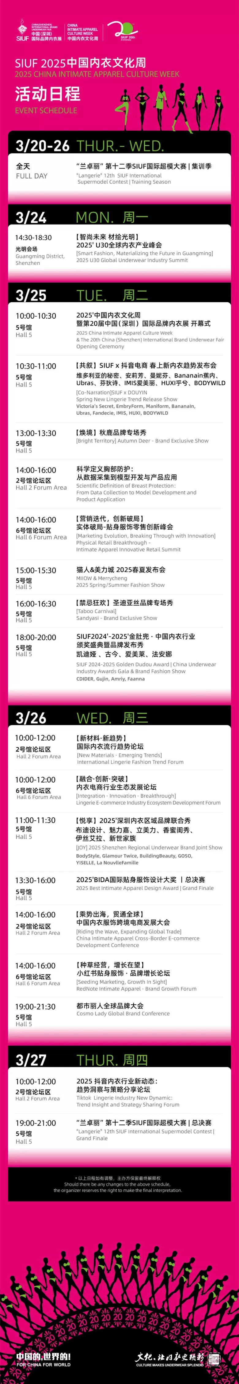 第20届中国国际品牌内衣展将于2025年3月25日至27日在深圳会展中心(福田)举办,展览面积达10万平方米,汇聚超1000家品牌,呈现数万精品,打造集采购、人脉拓展、渠道对接和趋势洞察为一体的一站式行业优质平台。