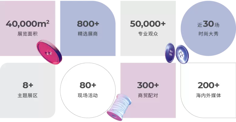 超 40,000 平米的商贸天地,8 大主题展区闪耀其中,800+ 展商携前沿尖货齐聚,从面料创新到成衣惊艳,全产业链精华尽汇。30 场大秀、80+ 场活动,秀场的绚烂与知识的碰撞交织,更有300+ 精准商贸配对,为你链接无限商机,驱动时尚新未来。