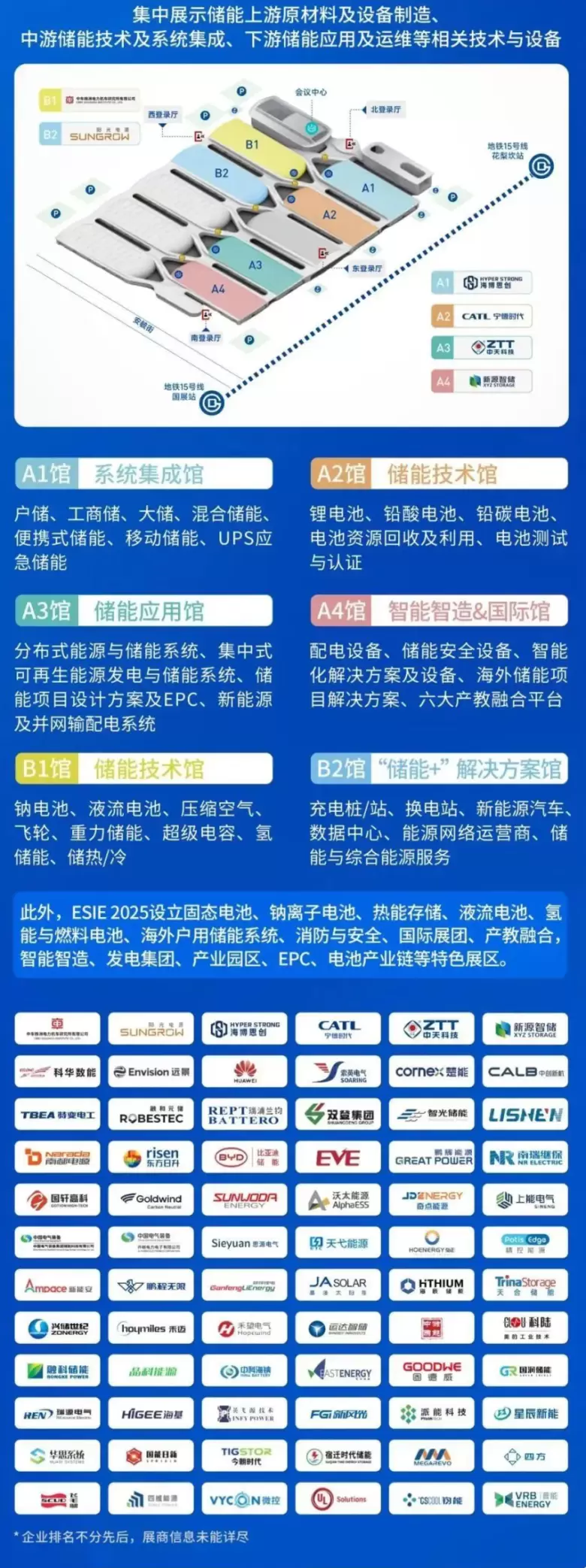 ESIE 2025将设立六大主题展馆,展览面积达160,000+平方米,汇聚800+储能展商,4000+产业链上下游企业。展品范围广泛,从储能技术、系统集成到智能制造,再到储能+解决方案,全面覆盖储能全产业链的12大关键领域,为观众带来一场储能技术的盛宴。