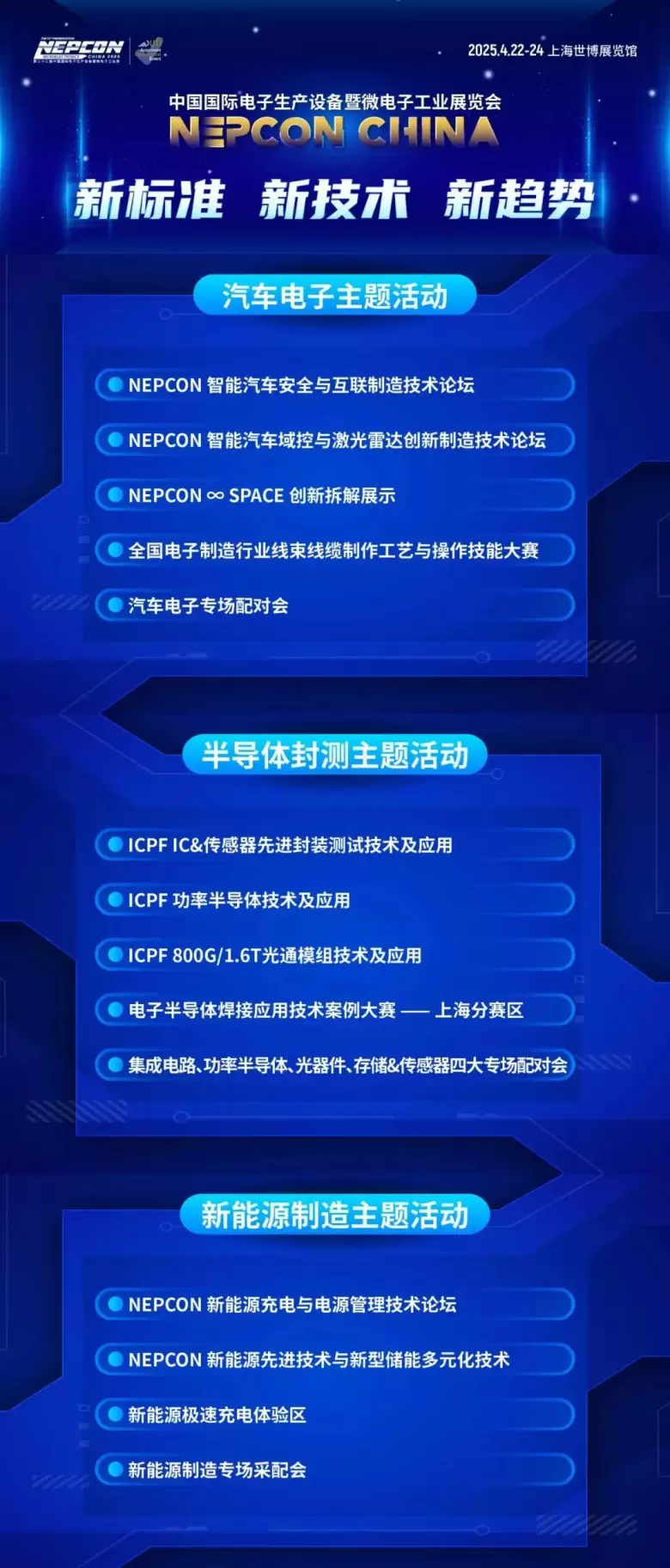 NEPCON China 2025 中国国际电子生产设备暨微电子工业展(上海电子展)通过“创新展示+会议+比赛+专场对接会”的多元形式,聚焦汽车电子、半导体封测和新能源制造三大高增长行业,分享技术应用与未来发展,呈现行业新标准、新技术和新方案。