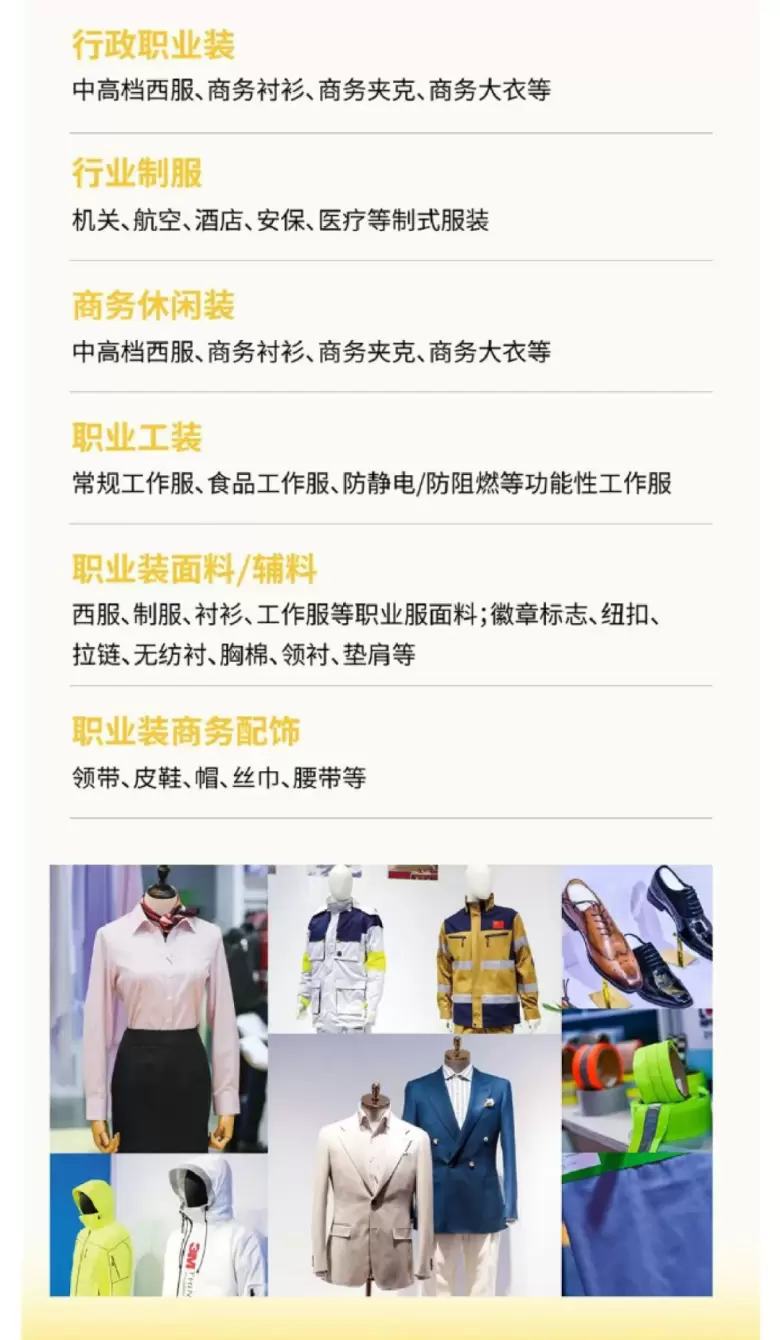 A: 展品范围非常丰富!涵盖了行政职业装、商务休闲装、职业工装、职业装面料/辅料以及职业装商务配饰等。