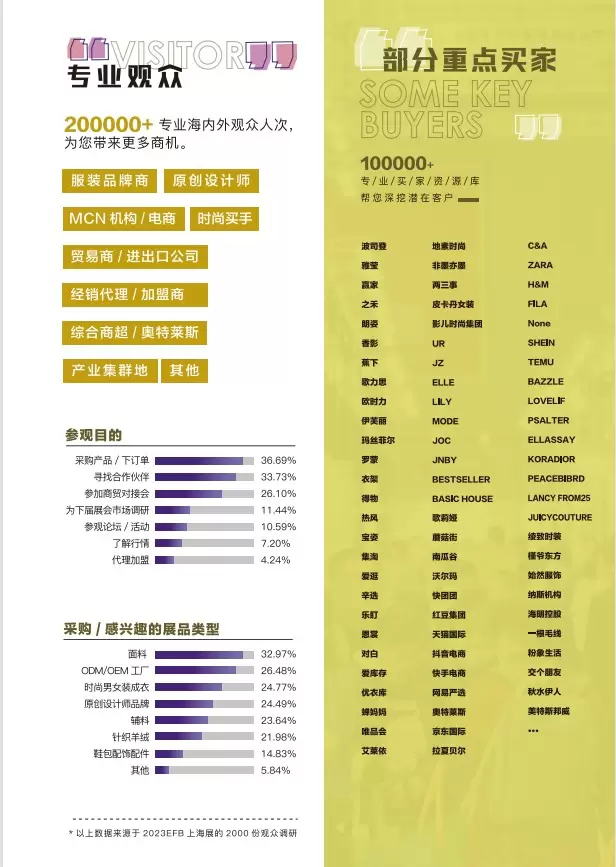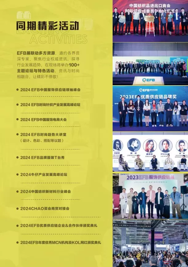 上海国际服饰供应链博览会(EFB)“整合服饰供应链,驱动行业新未来”为核心,贯穿纺织服装服饰产业链上下游,为生产商、品牌商及贸易商提供趋势发布、展览展示、信息交流、商贸合作和获取订单的渠道,展会深度挖掘行业新商机。