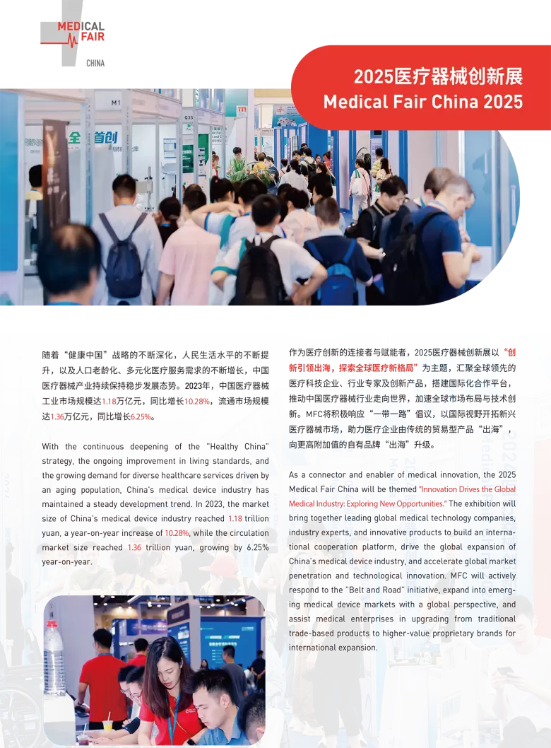 作为医疗创新的连接者与赋能者,2025医疗器械创新展以“创 新引领出海,探索全球医疗新格局”为主题,汇聚全球领先的医疗科技企业、行业专家及创新产品,搭建国际化合作平台, 推动中国医疗器械行业走向世界,加速全球市场布局与技术创新。MFC将积极响应“一带一路”倡议,以国际视野开拓新兴 医疗器械市场,助力医疗企业由传统的贸易型产品“出海”, 向更高附加值的自有品牌“出海”升级。