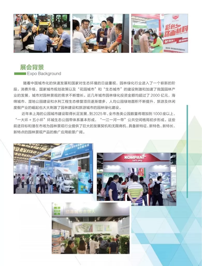 上海园林景观展(China Landscape & Greenery简称:CLG)由上海市园林绿化行业协会主办。自2003年开始每年主办,是国内历史最悠久、影响最广的园林景观行业盛会,获得业界人士高度评价。近几年展会升级为中国(上海)园林景观产业贸易博览会后,在保持园林景观设计、景观建材及设施、立体绿化等原有内容的基础上,引入生态旅游景观概念,丰富园林机械机具、游乐设施、景观竹材、园艺资材、家庭园艺产品板块,打造大园林的完整产业链。