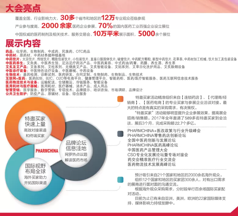上海药交会-全国药品交易会-上海中医药博览会(PHARMCHINA)专区专展:设立品牌主展厅、化药、中成药、OTC、中药材、中药饮片、中医药养生、生物技术与创新、互联网+医药、高端健康茶、营销解决方案、医药物流技术与设备展区,“专区专展”的展出模式极大程度地为您凝聚目标观众。