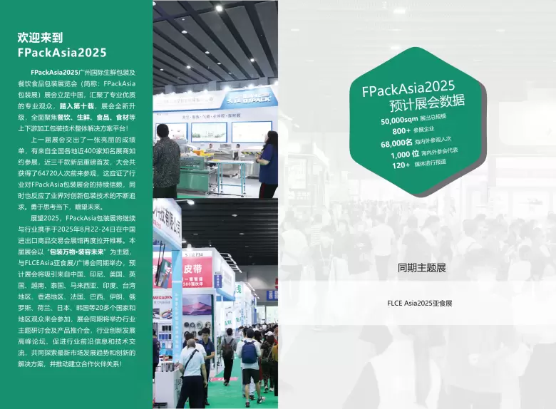 FPackAsia2026广州国际生鲜包装及餐饮食品包装展览会(简称:FPackAsia包装展),展会立足中国,汇聚了专业优质的专业观众,2026年展会全新升级,全面聚焦餐饮、生鲜、食品食材包装等上下游加工包装产业整体解决方案!助力行业实现绿色、低碳、可持续发展,引领行业向智能包装的国际化新阶段迈进。