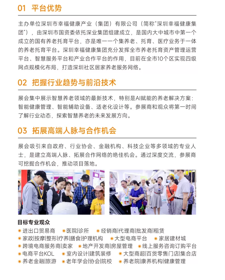 深圳智慧养老展是聚焦智慧养老领域的国际性盛会。本届展会以“科技赋能,共创银发经济新局面”为主题,汇聚全球智慧养老产业领域的最新应用。展会致力于推动智慧养老产业与科技、健康的深度融合,助力全球养老产业高质量发展,为“银发经济”注入新活力。