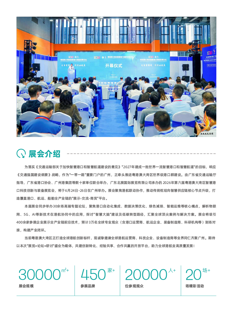 为落实《交通运输部关于加快智慧港口和智慧航道建设的意见》"2027年建成一批世界一流智慧港口和智慧航道"的目标,响应《交通强国建设纲要》战略,作为"一带一路"重要门户的广州,正牵头推进粤港澳大湾区世界级港口群建设。由广东省交通运输厅指导,广东省港口协会、广州港集团等数十家单位联合举办,广东北展国际展览有限公司承办的 2026年第六届粤港澳大湾区智慧港口科技创新与装备展览会,将于6月24日-26日在广州举办。展会聚焦港航联动协作,推动传统枢纽向智慧供应链核心节点升级,打造覆盖港口、航运、船舶全产业链的"展示-交流-商贸"平台。