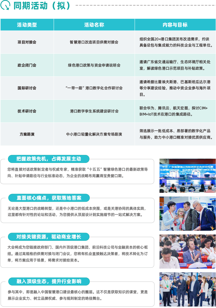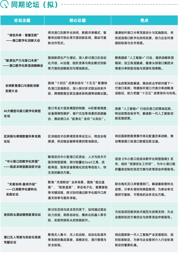 本届展会同步举办30余场高端专题论坛,聚焦港口自动化集成、数据决策优化、绿色减排、智能运维等核心痛点,解析物联网、5G、AI等新技术在港航协同中的应用,探讨"智慧大脑"建设及低碳转型路径,汇聚全球顶尖案例与解决方案。展会将吸引400余家参展企业展示全产业链前沿技术,预计3万名全球专业观众(含港口运营商、航运企业、装备制造商、科研机构等)到场对接,构建产业闭环。