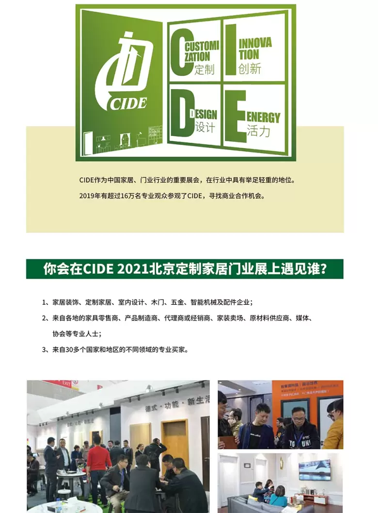 北京国际门业展-中国国际门业展(CIDE)是中国最大规模、最高品质的门业展览会。由中国林产工业协会、中国木材与木制品流通协会、中国门业俱乐部、中国伟士佳合国际有限公司联合举办。与中国国际集成定制家居展览会同期举办。在确保商贸合作基本功能的前提下,全面推进国际化、品牌化和趋势化,为中国建筑装饰行业搭建引领高端定制潮流的“开年首秀”。